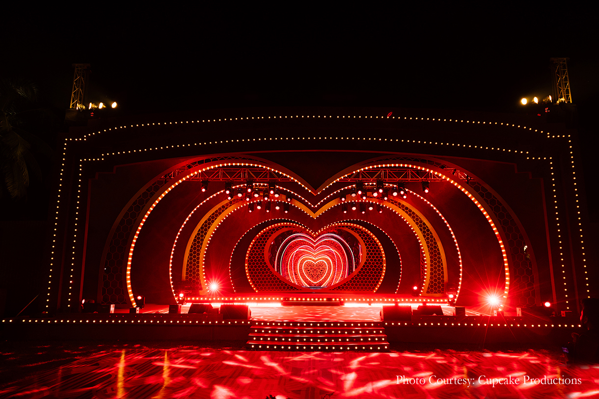 The Sangeet night was glamorous and edgy, with a bold heart-shaped stage that was unlike any other! The bride dazzled in a magnificent silver lehenga, while the groom shone in a sequined achkan. Their captivating performances, enhanced by a troupe of backup dancers, left the audience in awe, making the evening truly unforgettable.