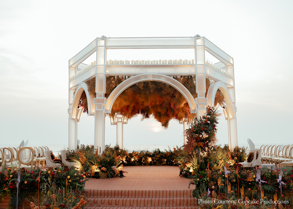 The beachside wedding was filled with the fiery brilliance of a sunset palette, with hues of orange and rust lighting up the twilight sky. The occasion saw rustic-chic decor, with plumes of flowers and earthy pampas grass. The couple exchanged their vows beneath a stunning floral mandap, and their union was celebrated with a breathtaking display of fireworks.