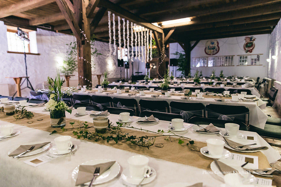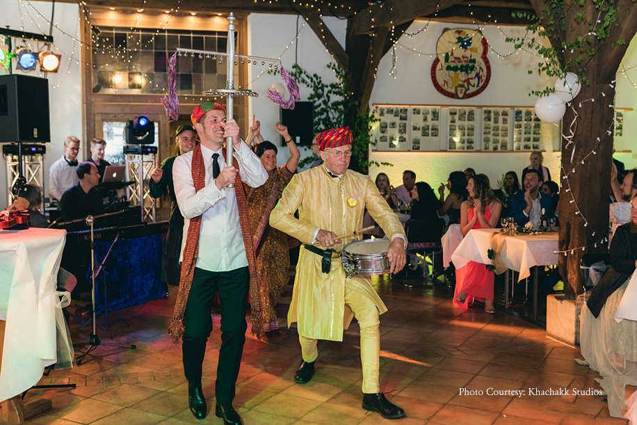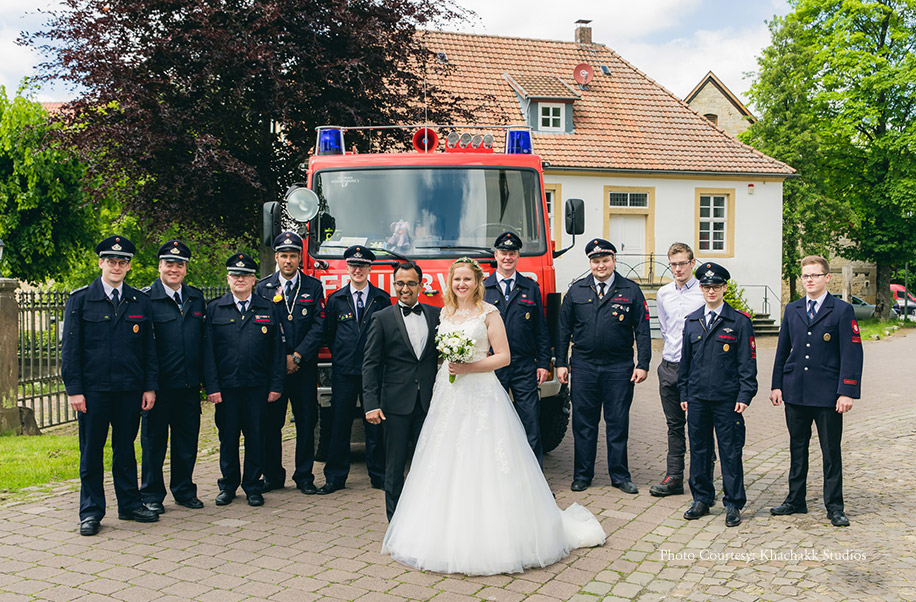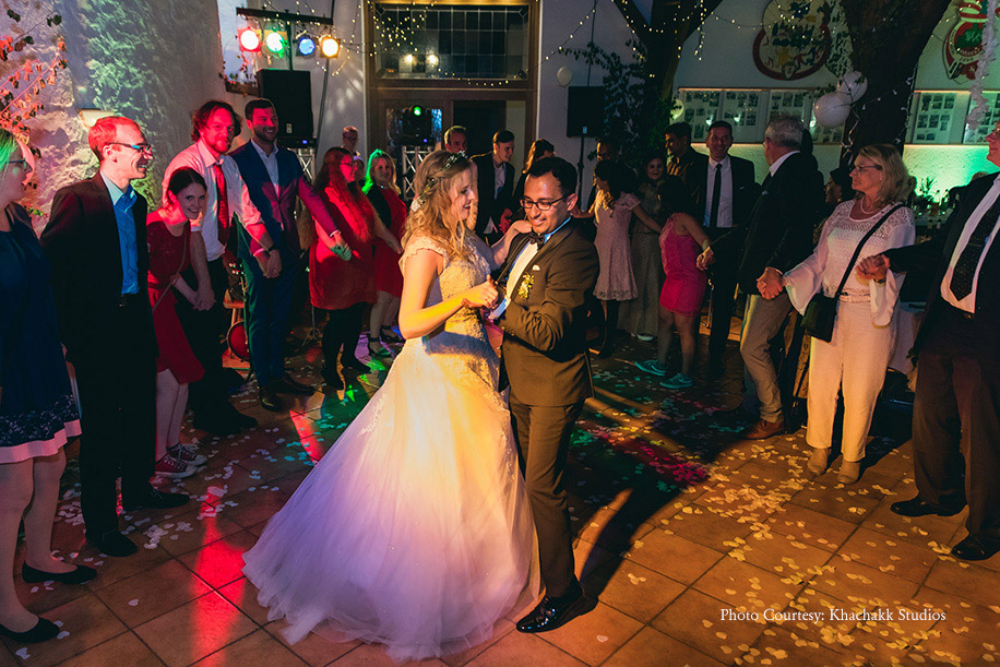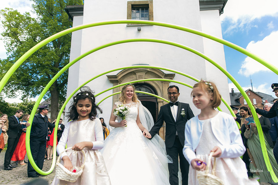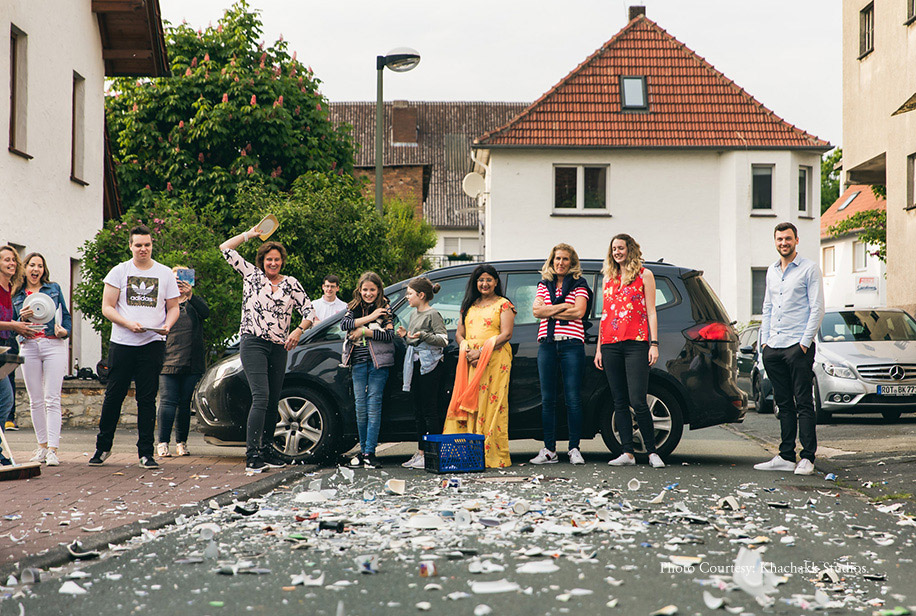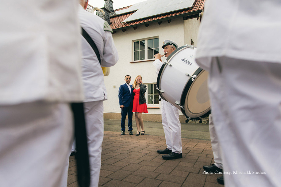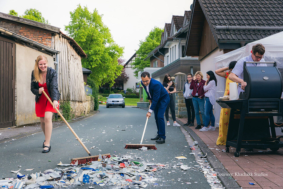 This fun ceremony took place in a small village called Fürstenberg, which also happens to be Vicky’s hometown. The celebrations commenced with the bride’s grandfather surprising her with a live band where his senior friends played sweet melodies on their flutes, drums, and metallophones before the Polterabend (pre-wedding) ceremony started. This whole setup was so emotional and it left the guests teary-eyed. This band gave a tough competition to the Indian wedding procession. During the live performance, the guests smashed plates, mugs, and even a washbasin on the road as a sign of good luck. The couple cleaned the path littered with broken ceramics after the ceremony. They even became slightly competitive in a cutesy, romantic way to see who cleaned up the path fast. The day went by with the guests enjoying a barbeque brunch in the lush green countryside