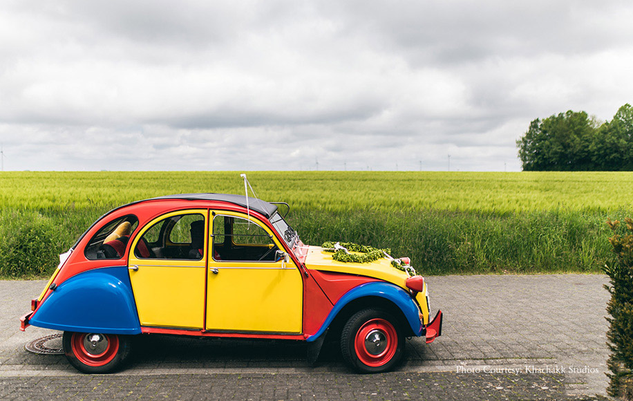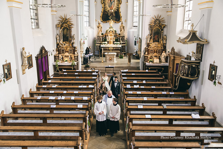 The duo had a beautiful ceremony in an adorable church in Fürstenberg. The day started with Vicky getting all dolled up in a stunning, white gown in a salon where she received a sweet letter from her groom-to-be. She entered the church in a colorful vintage car driven by her father where she was welcomed by little kids tossing rose petals on the road. The lovebirds exchanged rings and recited their wedding vows at the altar. Their rings had the world map engraved on it, with the northern hemisphere on one ring and the southern hemisphere on the other, signifying their world is incomplete without each other and only when the two are together, just like the rings, they become whole. They even cut a three-tier cake before getting into the party mood. The venue was beautifully done up in a minimalistic way by incorporating fairy lights, white flowers, and sprigs of green leaves.