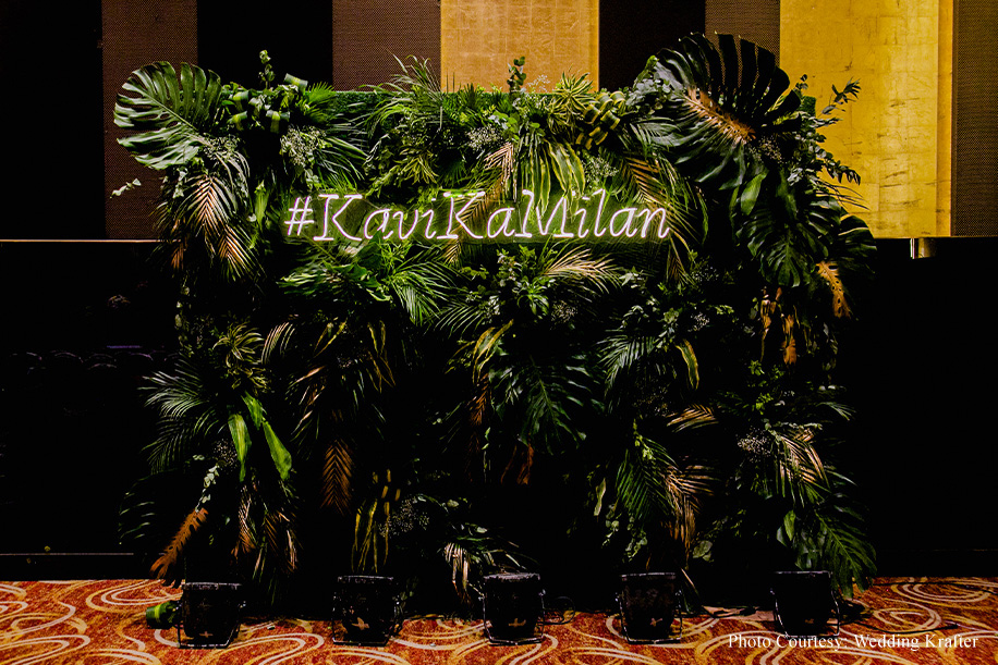Nikhil Murarka from Centre Point Events shares, “The Sangeet Night had a glamorous vibe. The couple entered with dancers flanking them. A geometric patterned high-low stage paired with an electrifying LED backdrop ensured everyone was energized! A personalized photo booth was installed with a 360-degree camera, with lush greens and ambient lights which highlighted the couple’s wedding hashtag.”