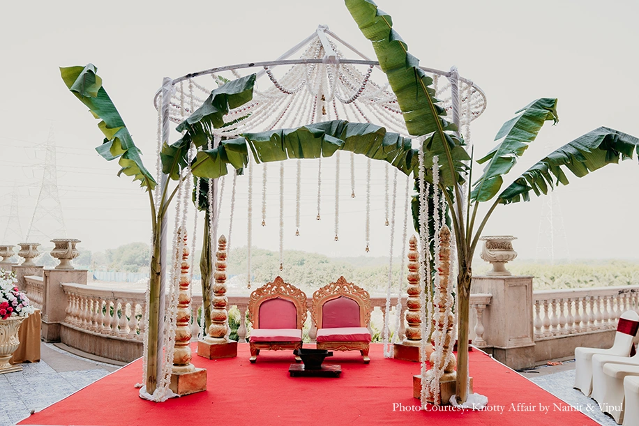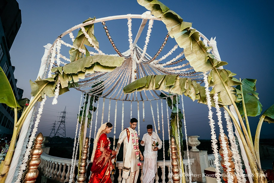 Hosted against the grand facade of the Seven Eleven Club, the wedding was a quaint affair marked with warm family celebrations. Minimal decor of flowers was used to highlight the gorgeous backdrop of the hotel, while the elegant mandap was crafted with a canopy of white flowers, banana leaves and traditional matka towers. The couple sported traditional Mangalorean wedding attire in white and red, and they tied the knot with Maharashtrian rituals to honor and include both their cultures. For the Reception dinner, the bride changed into a classic gold saree while the groom donned a black sherwani.