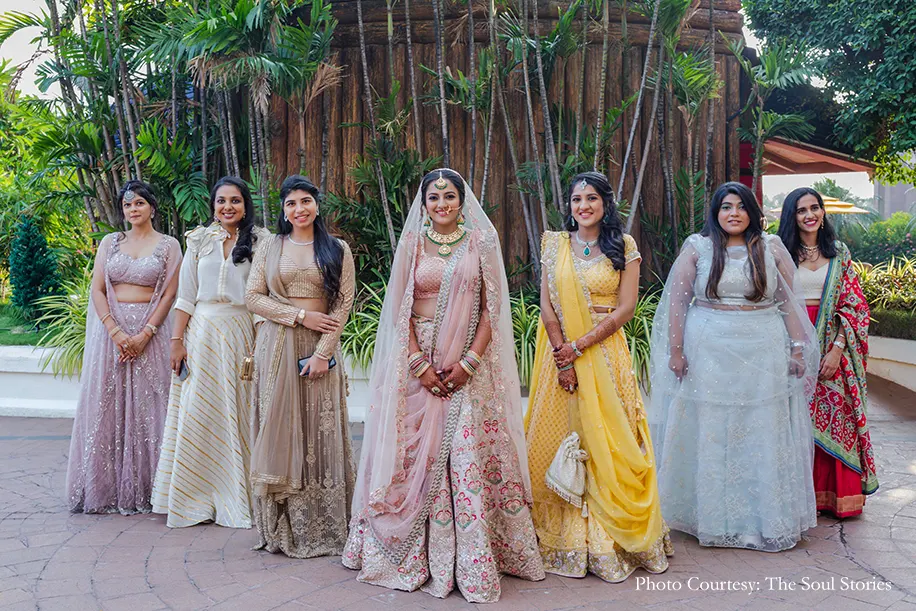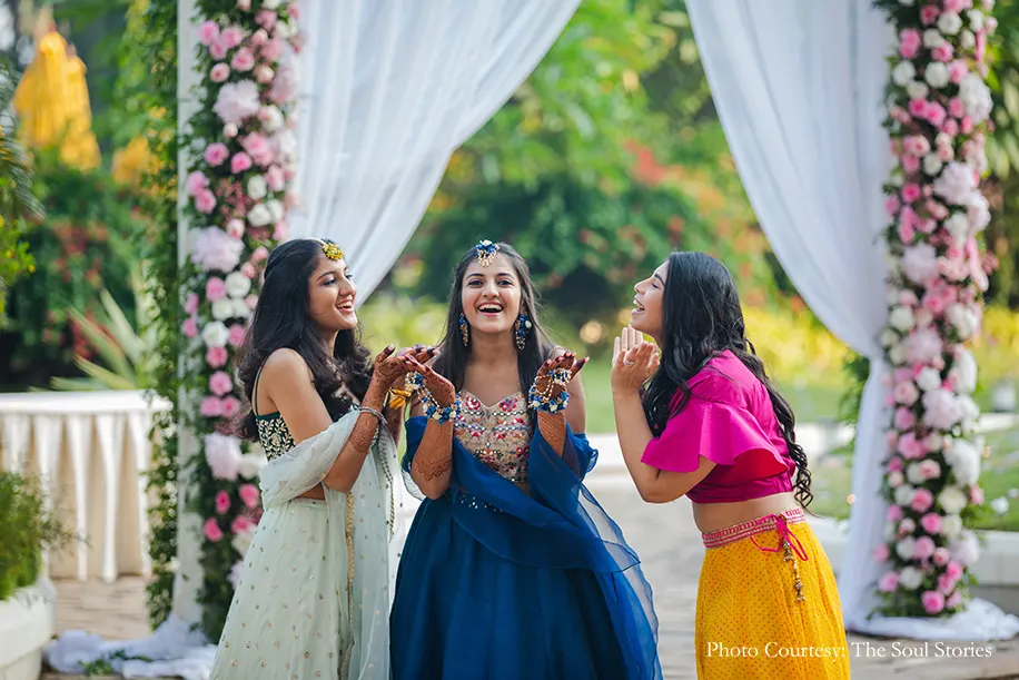 Swathed in myriad colors and hosted at one of Taj Land Ends’ sunlit terraces, the bride’s Mehndi exuded girly, carefree vibes. With a short guest list of close family and friends, Viyomi and her gal pals had a blast as they took in the stunning views of the golden shore while getting henna patterned on their palms.