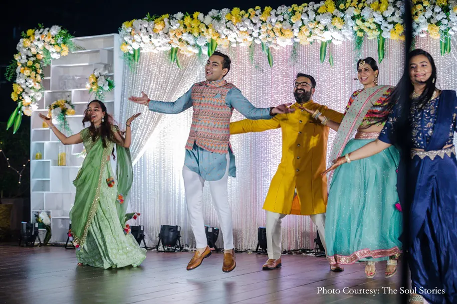 Similar to the other pre-wedding events, the groom’s Mehndi and grah shanti was also a close-knit event where Sahil celebrated with his loved ones. Swathed in shades of mint blue and yellow, it was a breezy event where Sahil and his loved ones enjoyed an evening of dance under the dark sky.