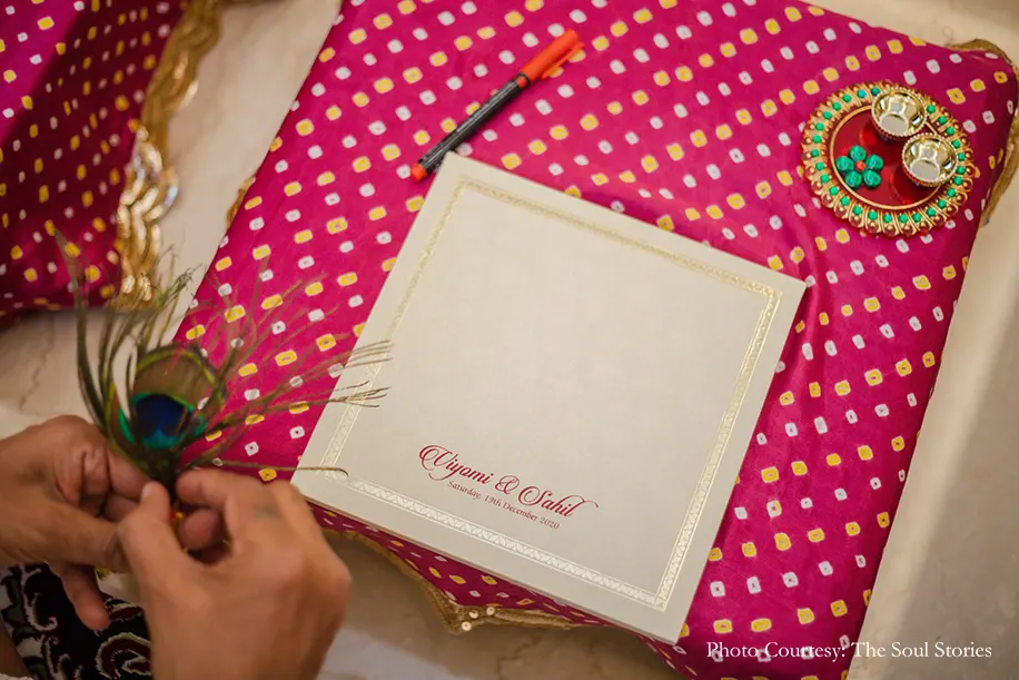 A Gujarati ritual where the first official wedding invite is written, Viyomi’s lagan lakhvanu was hosted at the bride’s home. Minimalistic and fresh, the home was decked up in bright orange and yellow marigolds that were perfectly in step with the bride’s delicate yellow lehenga!