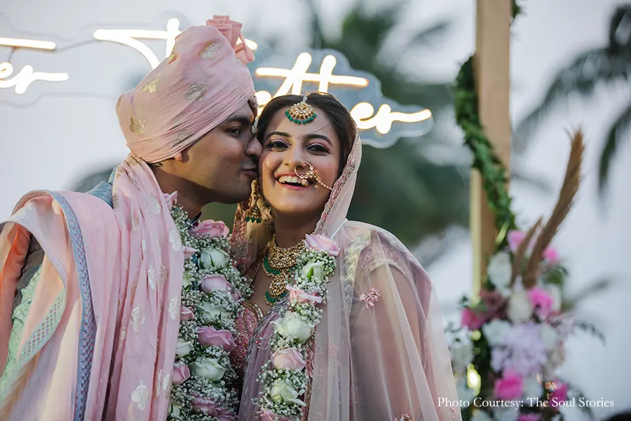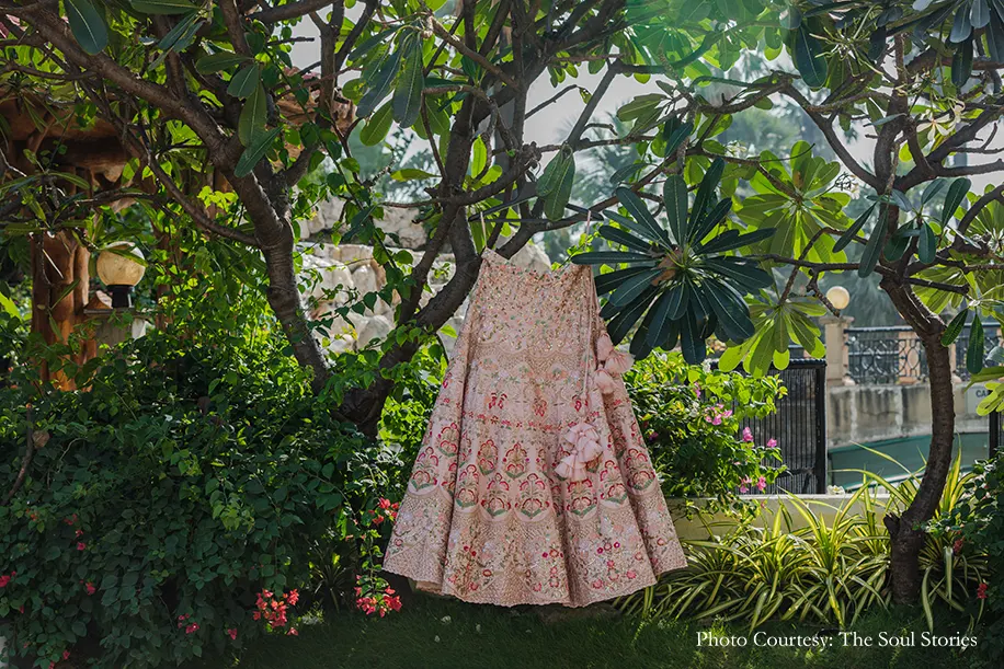 Dotted with pink blooms, pampas grass and a flashy neon sign that proclaimed, ‘Better Together’, the wedding was punctuated by laughter and romance! However, the highlight of the wedding was the gorgeous open-air acrylic pillared wedding mandap with a white-hued floral roof. Describing the little bespoke elements added to the decor, the bride shares, “We wanted a lot of custom personalization. Hence, on each of the tables, we placed a frame which depicted a fact about Sahil and me.” For her bridal entry, Viyomi surprised Sahil by executing a stunning dance performance which left him and all others present bedazzled! For every bride, her wedding lehenga is the most crucial outfit. Knowing this, Viyomi carefully chose hers. She shares, “For me, the lehenga was love at first sight! I visited many stores but hit gold at the Shyamal and Bhumika store. In fact, this was just the second lehenga that I tried on there!”