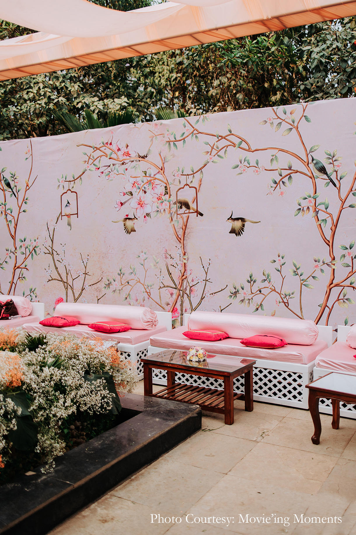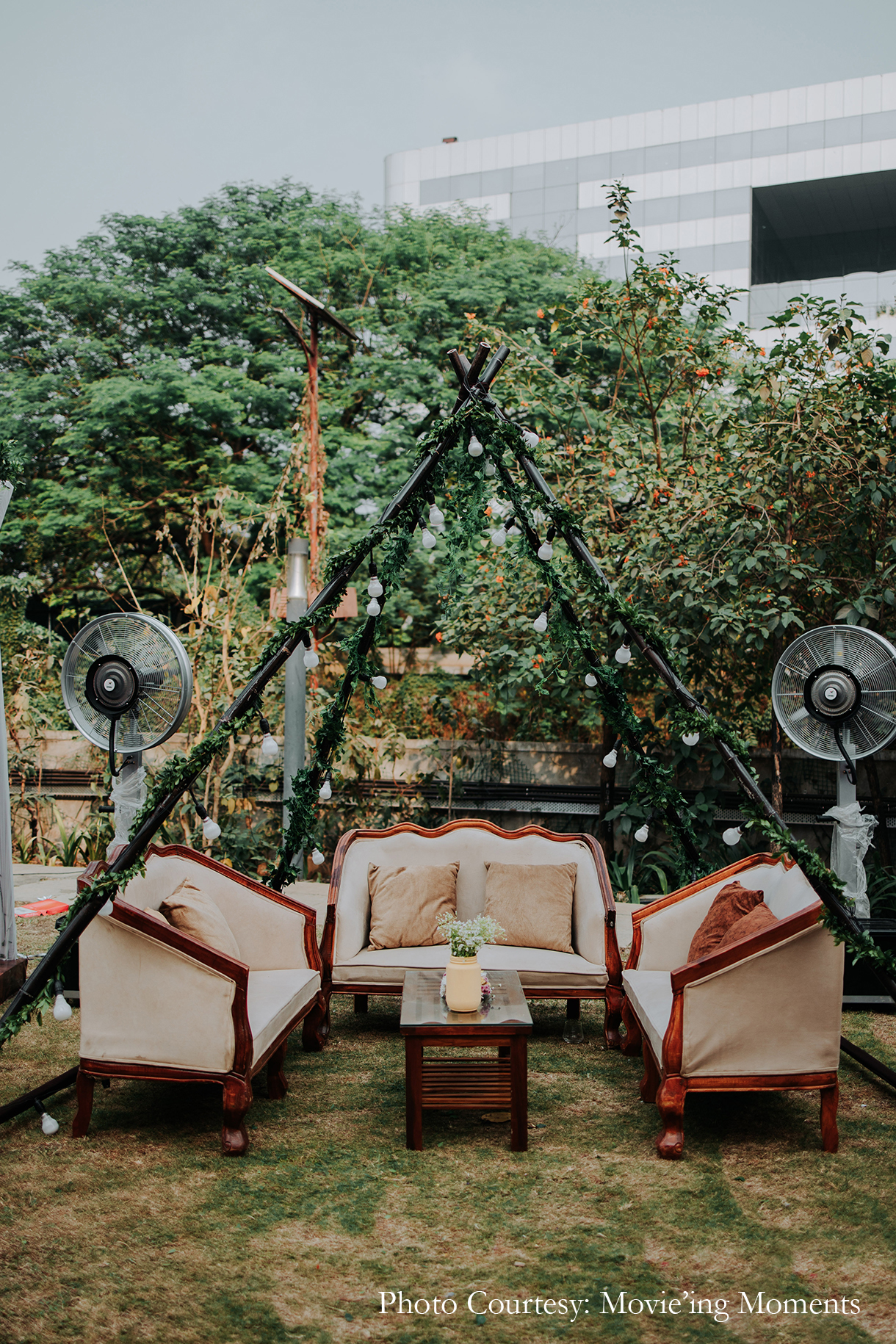 The Mata ki Chowki was hosted indoors with minimalistic decor. A foliage-filled backdrop fringed with blooms and an LED signage made for the perfect photo-op.