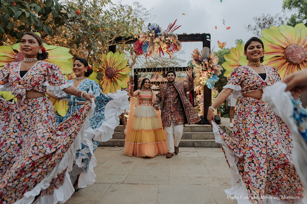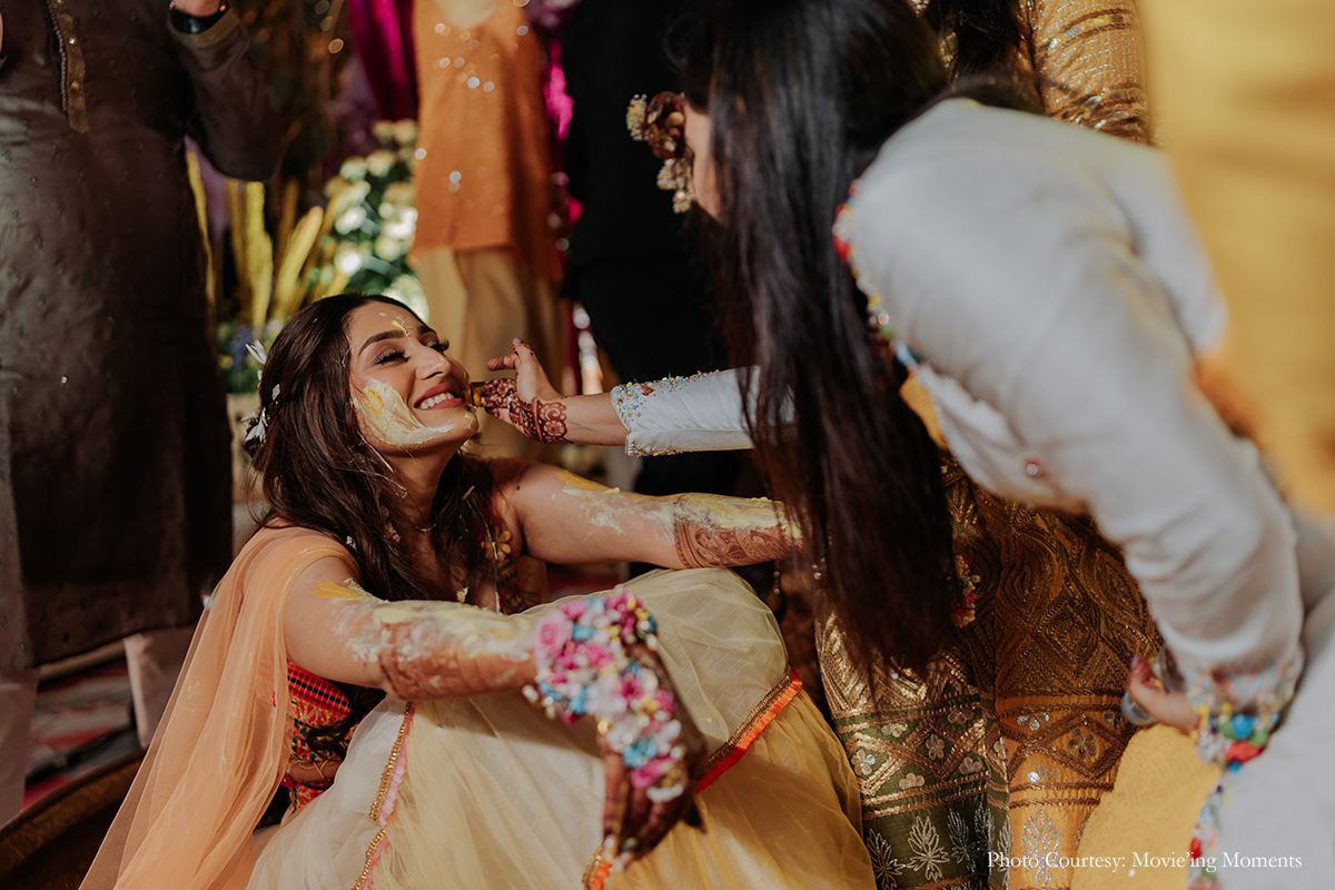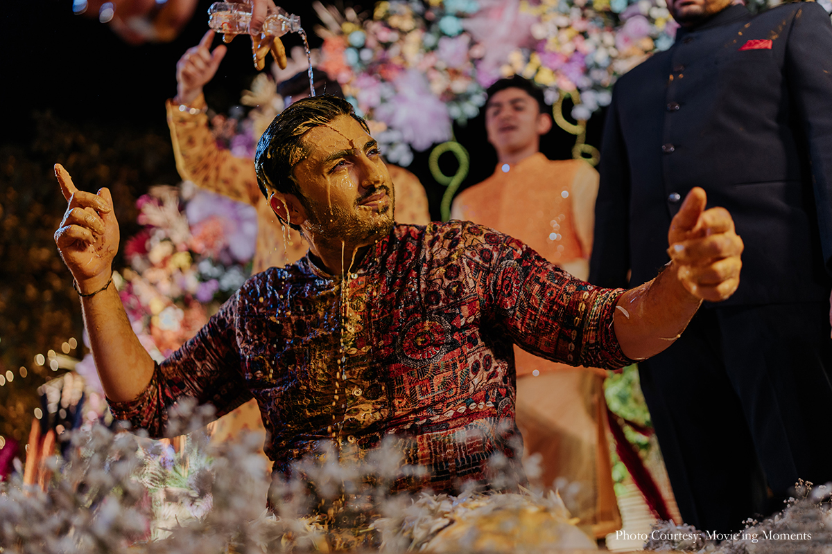 Next in line was the haldi and mehndi that brimmed with hues and followed a carnival theme. Yesha shares, “The day started with a mehndi event under the sunshine. The decor had a distinctly boho-rustic theme with lots of colours added via blooms. Floral arches and a vast dance floor were also a part of the decor. We hosted the haldi in the evening in the same setup with games and surprise performances from our families.”