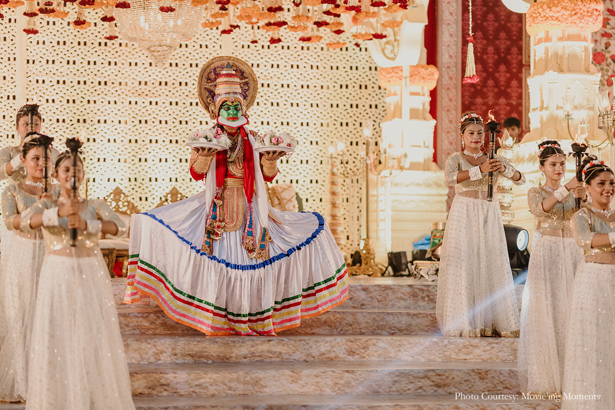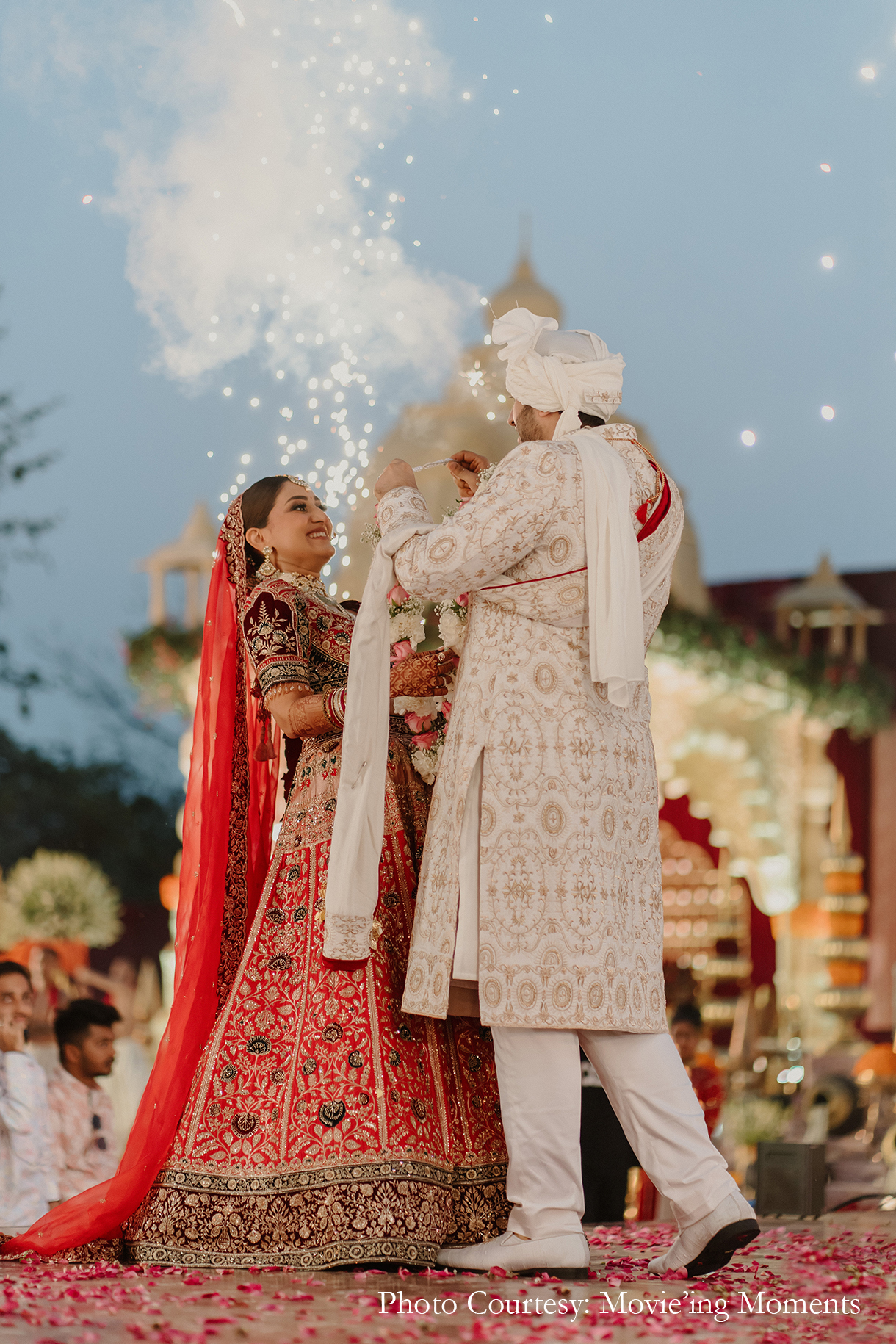 Yesha shares, “The spiritual vibes of Banaras have always been close to our hearts. Hence our wedding theme was inspired by the Banaras Ghats. The ‘Ganga Aarti’ was the highlight of the wedding along with carefully curated performances by professional dancers. A ceiling suspended with floral garlands and an ivory backdrop gave the mandap a striking appearance. As I walked down the aisle dancers heralded my entry and after the varmala cold pyros were lit up around us!”