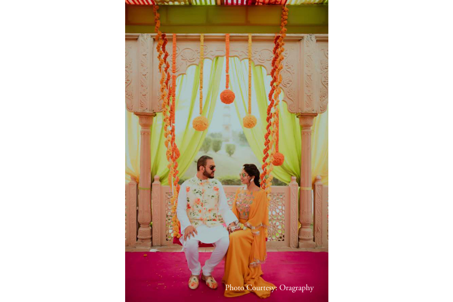 The wedding festivities took off with a haldi ceremony, where the couple’s loved ones gathered to celebrate the auspicious and fun ritual. The decor was resplendent with bright, colorful drapes and marigold blooms. The bride chose an amber-colored outfit with mirror-work on the bodice, while the groom wore a white kurta and bottoms with a floral-print bandhgala. Zorawar and Jasmine enjoyed every bit of their haldi, which involved games, laughter, dhols and a lot of dancing. The photographers captured them sharing a sweet moment on a swing that was accented with floral streamers.