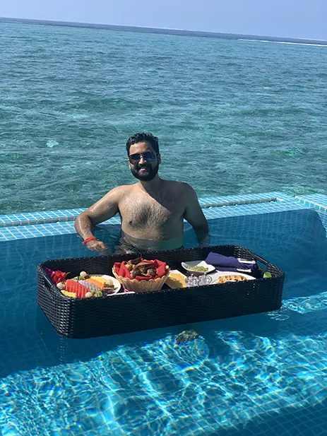 For their 5-day trip to the Maldives, the couple stayed at the 5 star Emerald Resort & Spa on Fasmendhoo Island. They made the most of their stay by opting for the Water Villa for the first 3 nights, and then shifting to the Beach Villa for the last two. From adventure activities like scuba-diving and dolphin watching, to mesmerizing sunsets, enjoying a sumptuous floating breakfast in the pool and private dinners on the beach, they enjoyed all the experiences and natural beauty that Maldives has to offer.