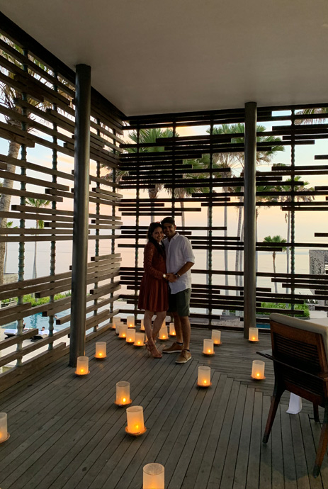 “Harsh had organized a surprise rooftop date for us in Alila Villas Uluwatu where a four-course meal awaited us in one of their ocean-view cabanas. Decorated with white lanterns and with a bottle of champagne waiting to be popped, the whole setup looked like it was straight out of a dream!”