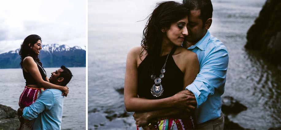 Nisha and Snehal also booked a couple’s photoshoot with wedding photographer Lauren Roberts. “We set out in light summer outfits on our first day in Alaska, hoping the sun would show us some mercy. But the wind unveiled its dramatic force as it blew and whistled that evening. We experienced a true taste of Alaska’s unpredictable weather so we stayed close to keep each other warm. We headed over for a sunset shoot along Turnagain Arm of the Seward Highway on our first Alaskan evening. We reached a scenic overlook at Beluga point and watched the water reflect a greenish tinge from the moss covered rocks. We closed our eyes to experience the beauty and to forget the cold. Our spirits felt free and the beauty of the nature around us refreshed our souls!”