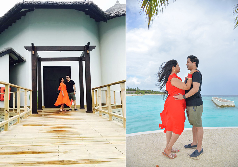 “After four days of our extravagant wedding celebrations, we wanted a peaceful destination to relax in for a week. We were clear that we wanted to avoid a lot of local/ intercity travel or shopping, so we ruled out a long European tour, especially fun and adventurous Eastern Europe hotspots. We narrowed our choices down to Santorini, in Greece and the Maldives, and researched the best properties at both destinations. We finally picked the Maldives as their luxurious properties offered extra privacy and quiet surroundings, and booked into the Jumeirah Vittaveli Maldives