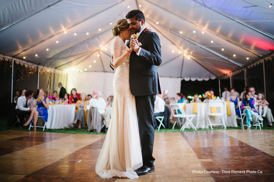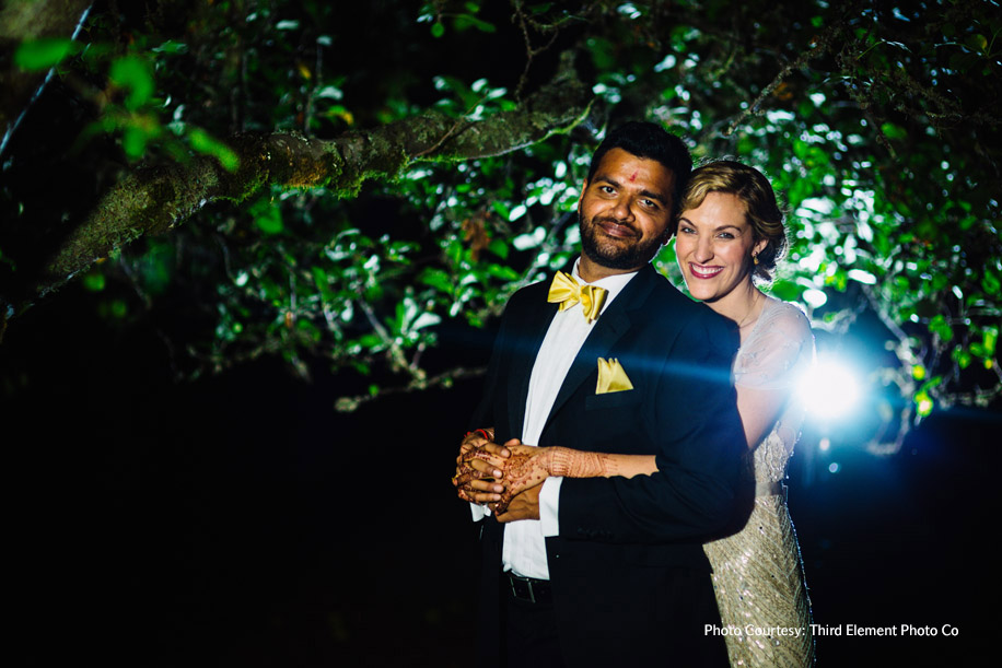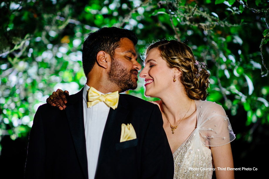 For their sangeet, Adrienne wore a pretty bright yellow lehenga, while Gaurav opted for a sherwani and a dupatta of the same hue. The bride’s father and friends, who are musicians, lit up the evening with their foot-tapping music. Guests sand and danced to the tunes in the beautiful venue where the colorful decor was the highlight of the event. The most important guest of the evening, Rusty, their dog, was made to sit on the same swing as the to-be-weds.