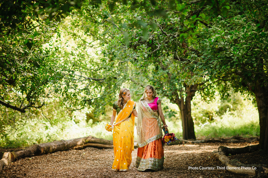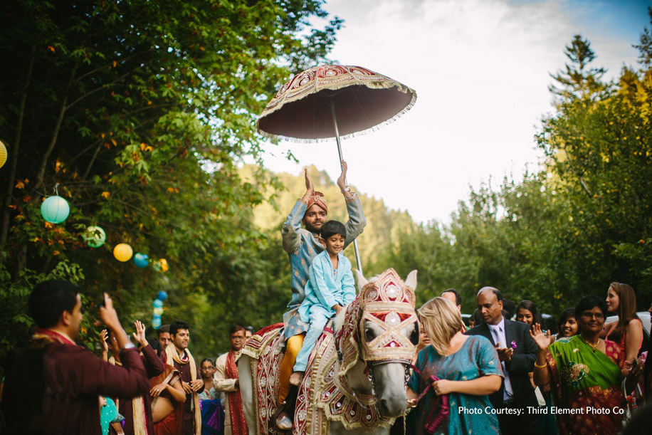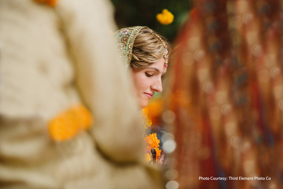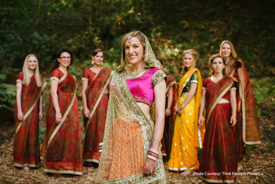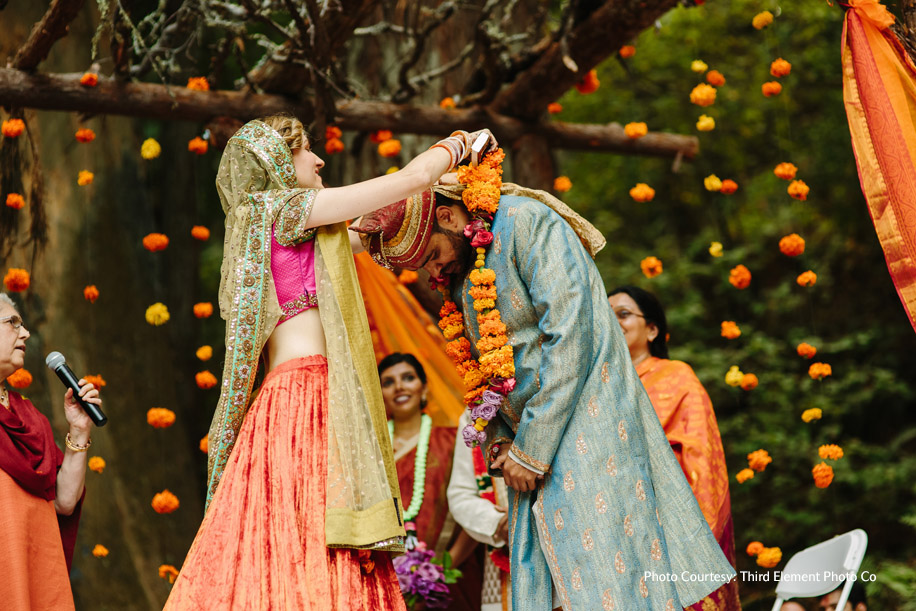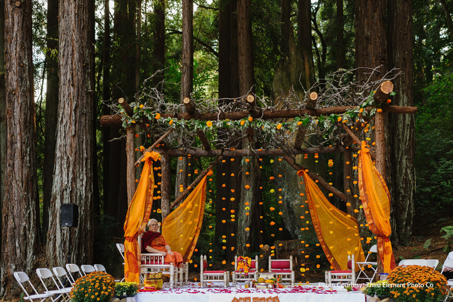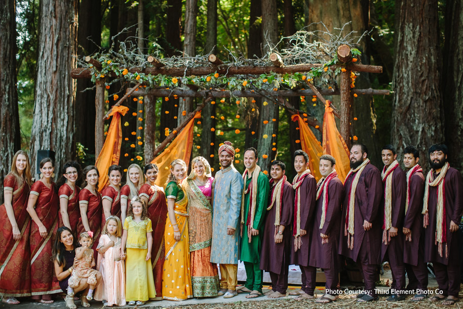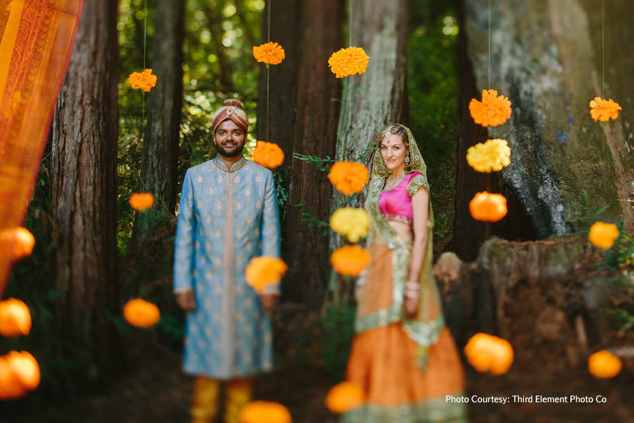 The day started as Adrienne got ready for the religious ceremony that was to be held in the backyard of her parent’s home. Gaurav arrived on a white horse to mark the beginning of the ceremony. He was surrounded by close family and friends who danced all the way till the venue. Built by Adrienne’s father and lovingly decorated by the duo’s mothers, the mandap held deep significance for both Gaurav and Adrienne. The duo exchanged their vows as per a Hindu ceremony under a beautiful redwood canopy, that was shadowed by a grove of tremendous redwoods. Beautiful orange drapes decorated the pillars of the mandap, while yellow and orange marigolds were suspended behind the couple to make a pretty backdrop.Adrienne wore an orange velvet lehenga that was paired with a bright pink blouse and a net dupatta, while Gaurav opted for a blue sherwani.