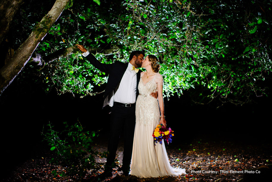 Most Indian weddings are resplendent with vibrant colors, gorgeous decor, and ornate mandaps. However, Gaurav and Adrienne’s cross-cultural wedding had a lovely rustic vibe. This ‘Boho-Chic Indian Fusion’ essence was seen in the lush, forested venue and wooden mandap under the glorious redwoods of Aptos, California.