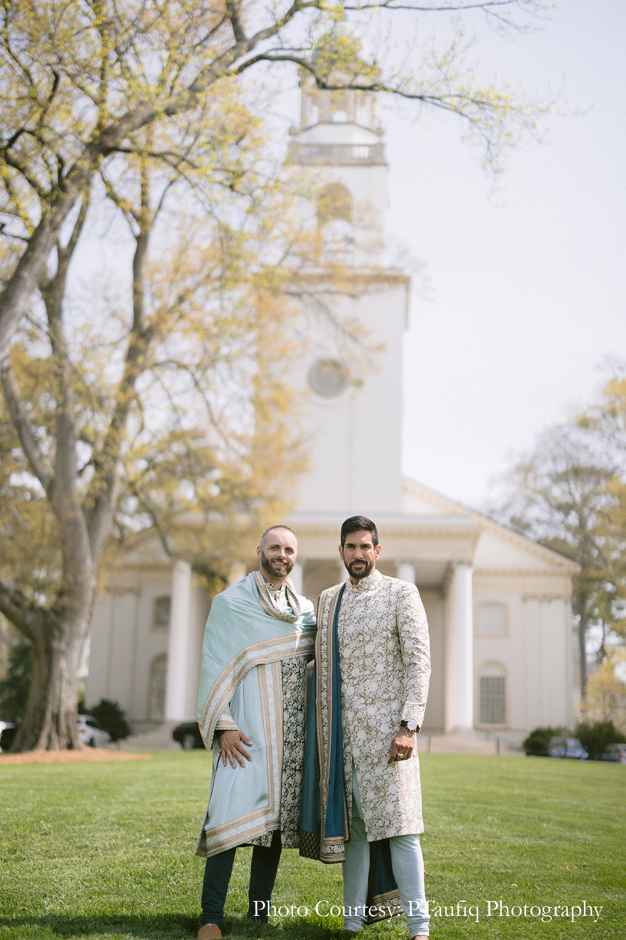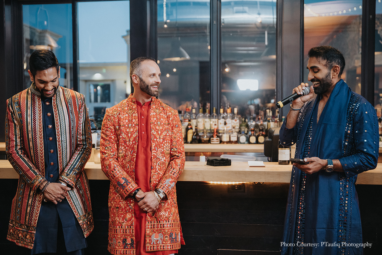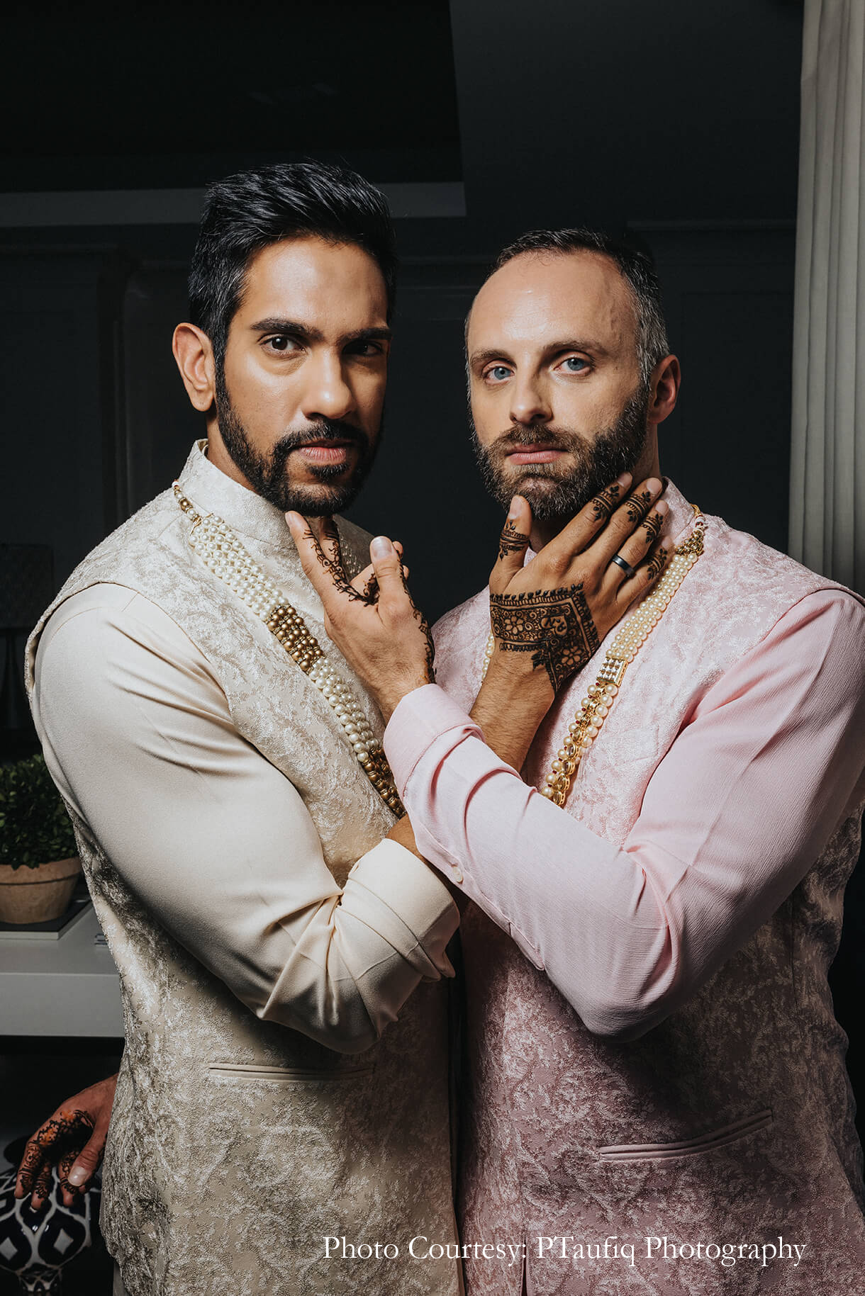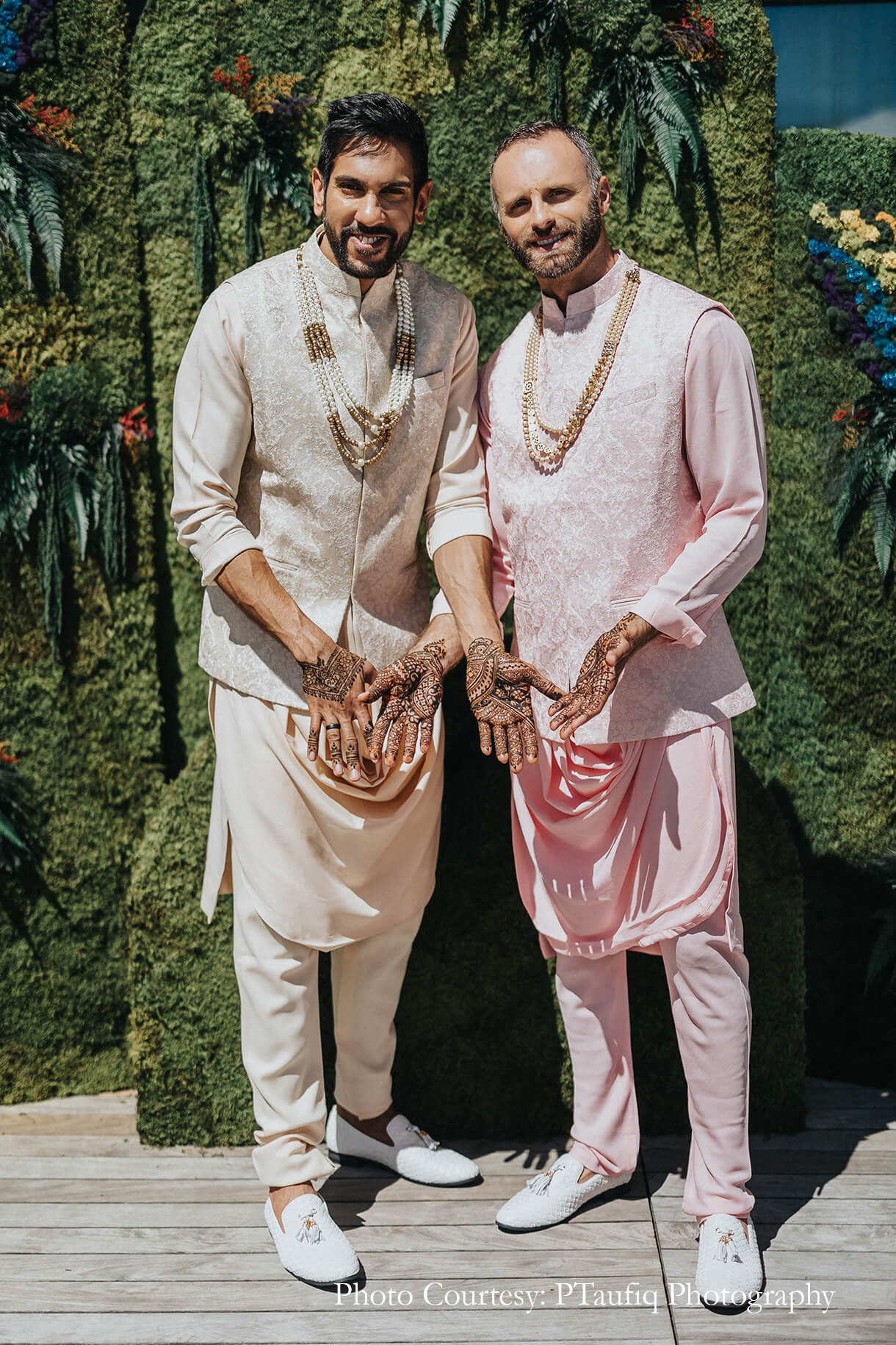 Grooms’ Outfits: Rivesse by Ishan Sanghvi (Mehndi, Reception), Nazraana (Sangeet)