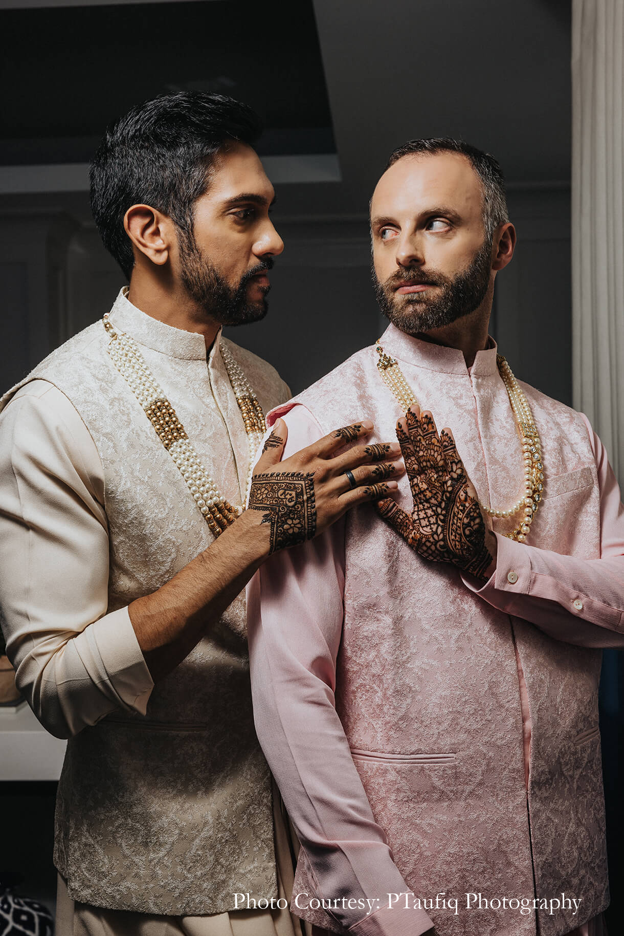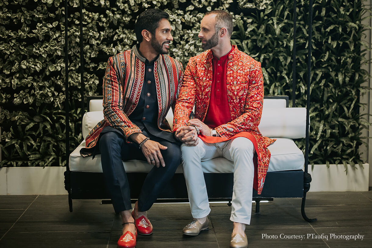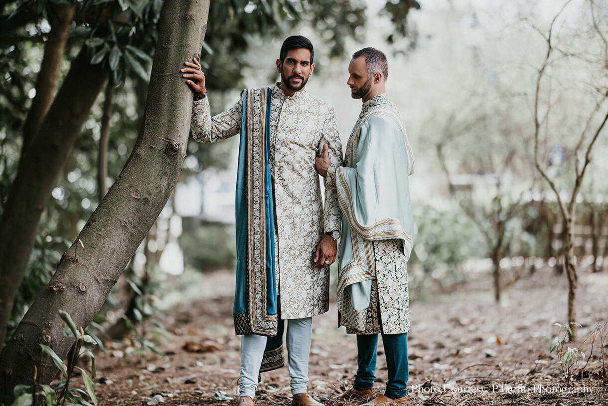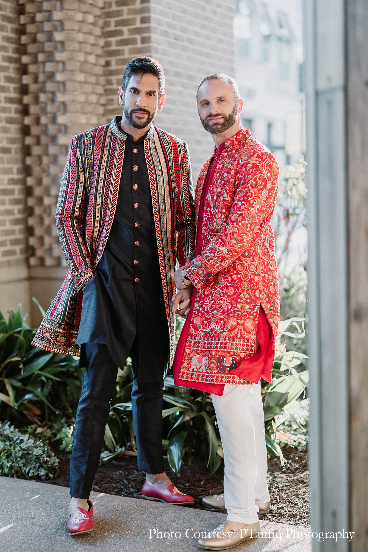 Grooms’ Outfits: Rivesse by Ishan Sanghvi (Mehndi, Reception), Nazraana (Sangeet)