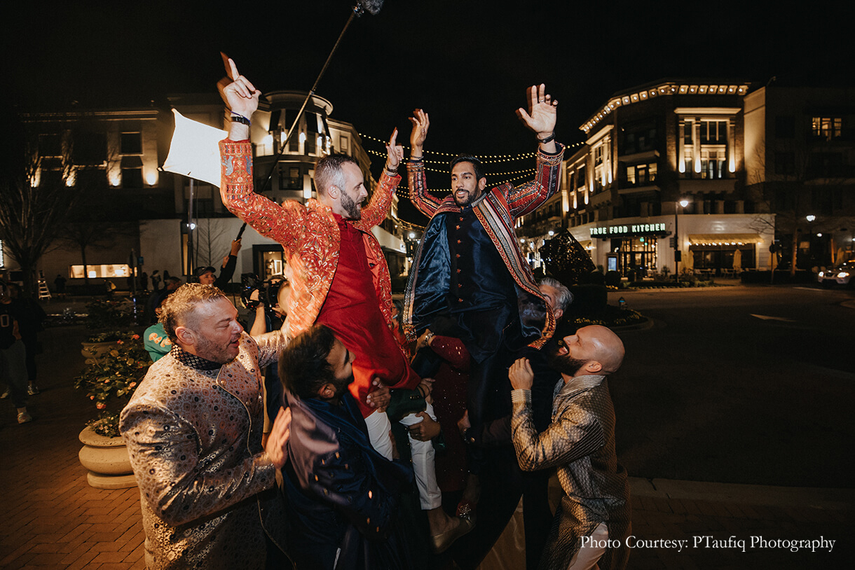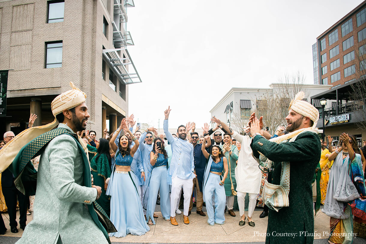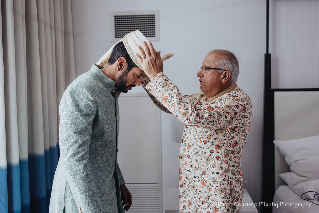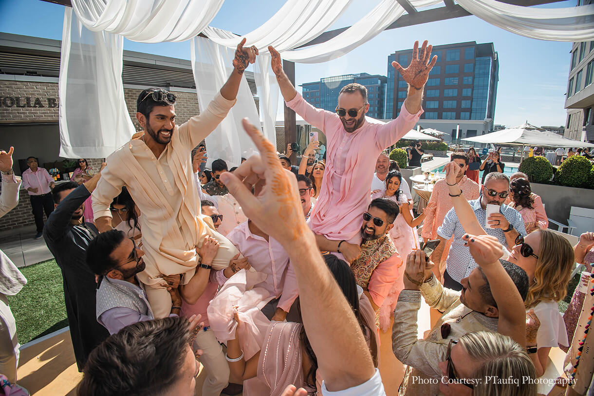 Grooms’ Outfits: Rivesse by Ishan Sanghvi (Mehndi, Reception), Nazraana (Sangeet)