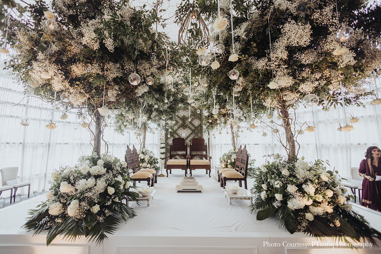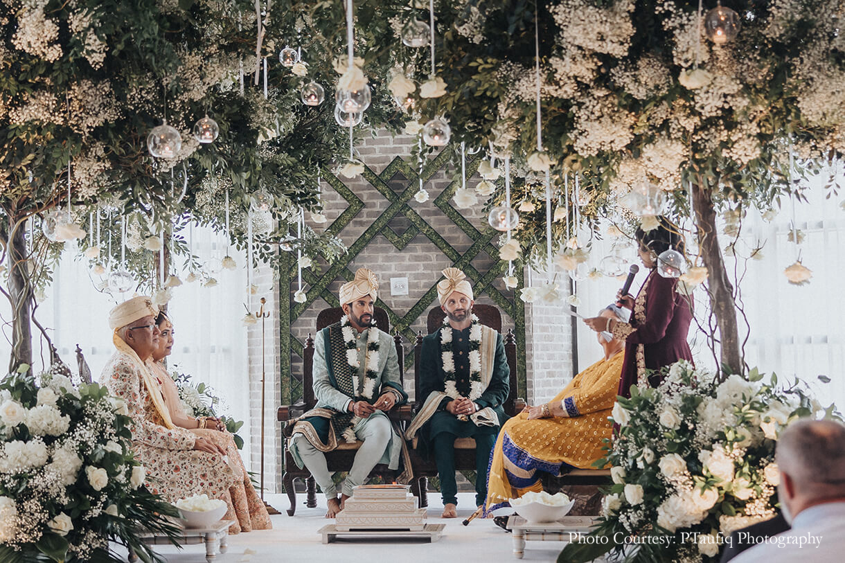 Amrit shares, “We wanted to coordinate the theme of the greenery of the mandap with our bespoke sage green and hunter green sherwanis. And, to make this vision possible, our planner was very innovative and brought the great outdoors inside for our mandap! White blooms, lush foliage, delicate lanterns and baby’s breath made the indoor venue look stunning.”