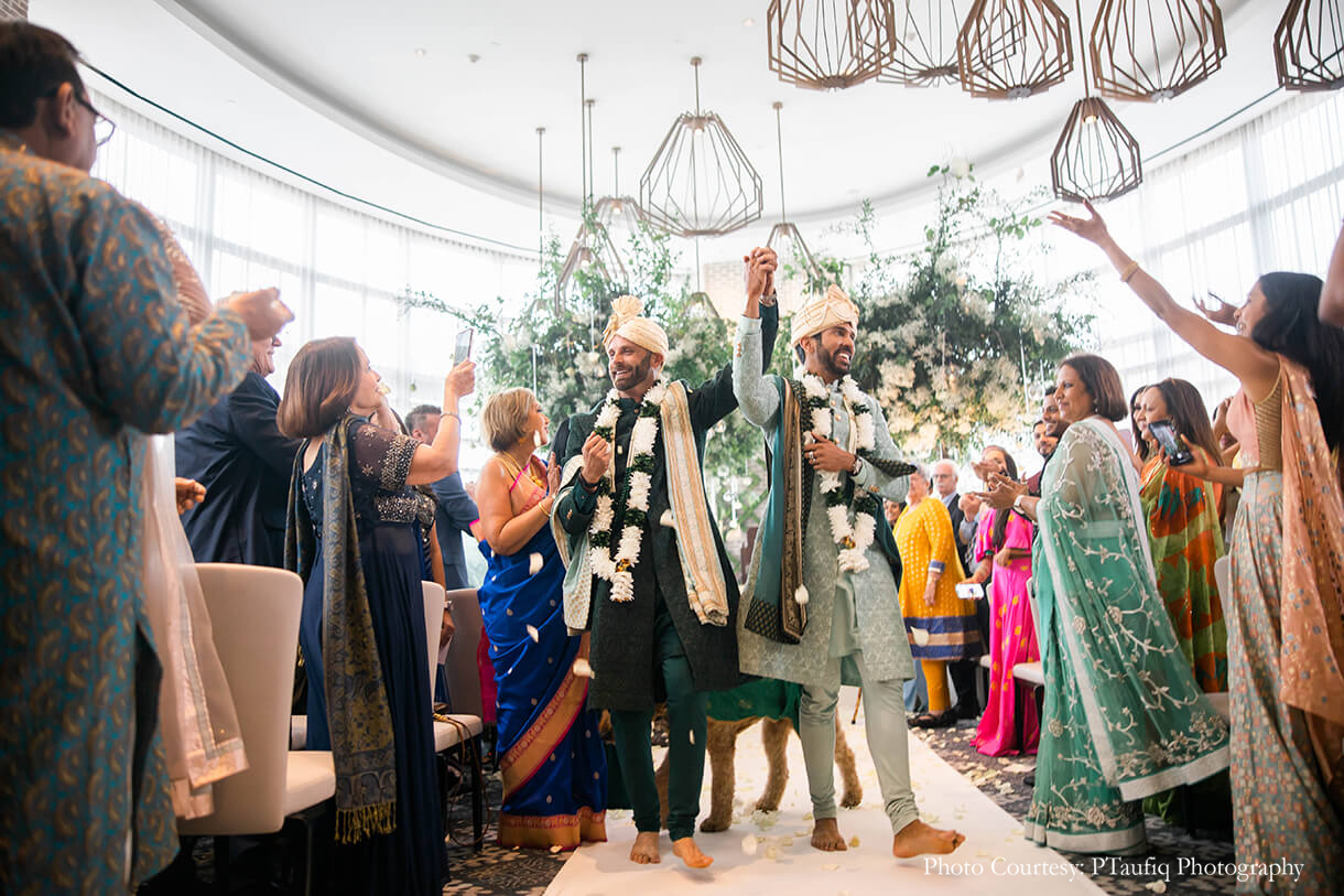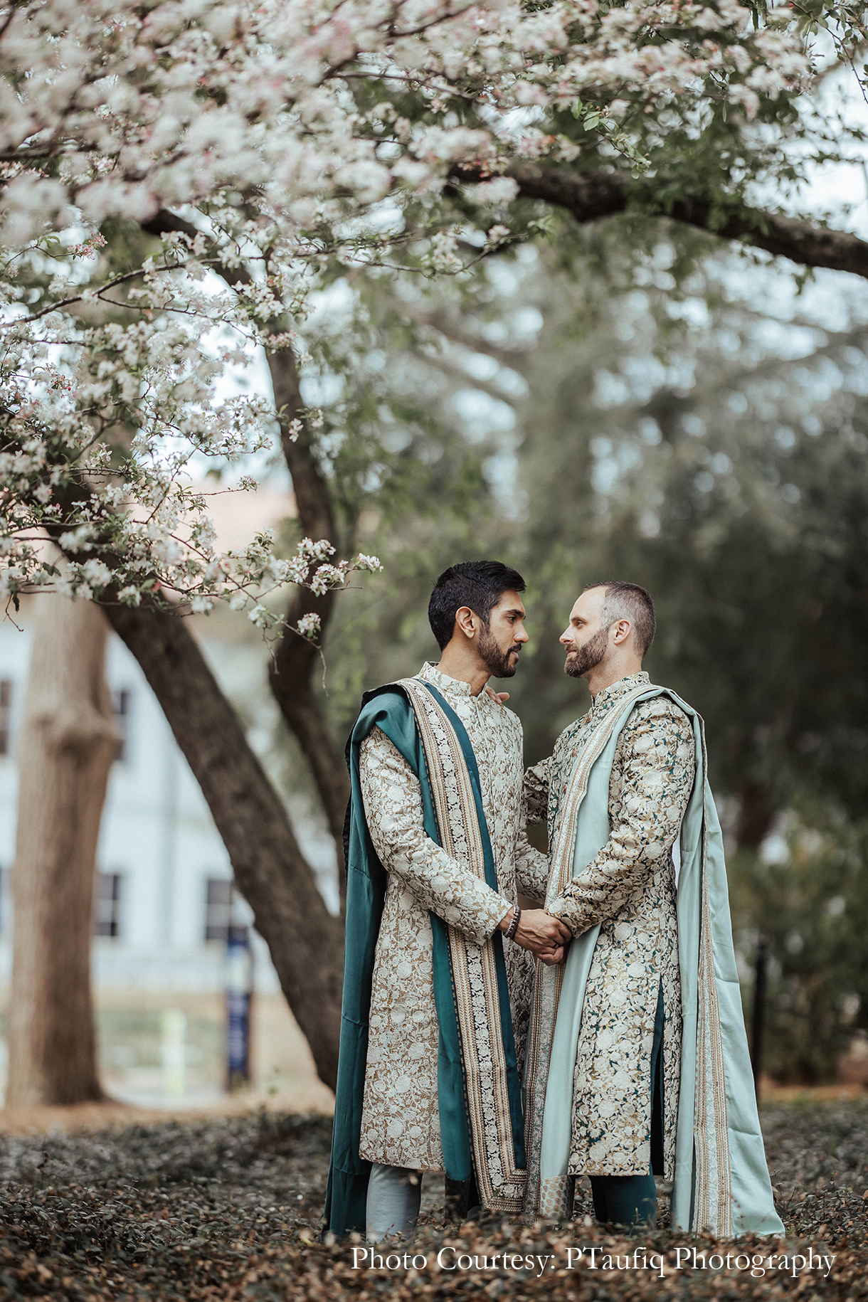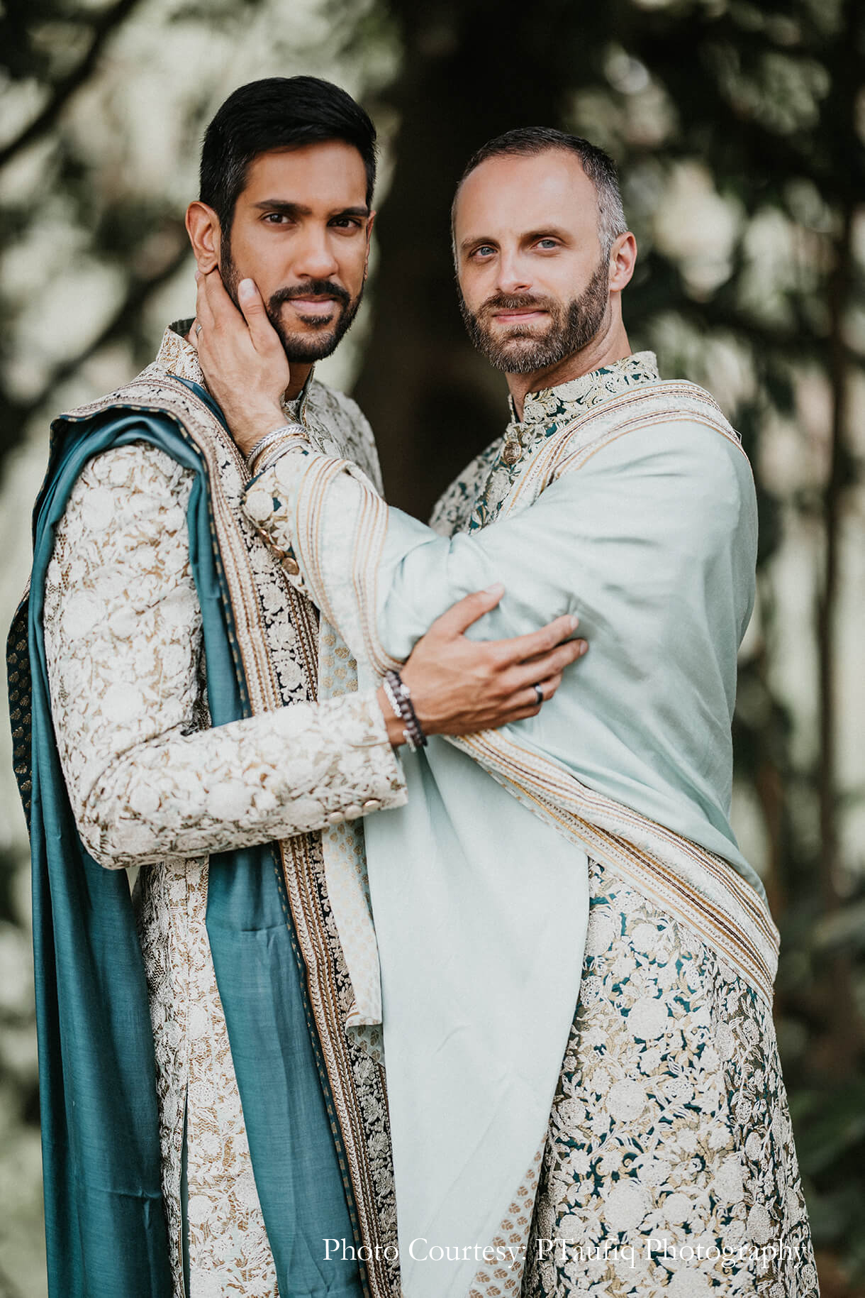Amrit shares, “Although we each spoke to our respective parents in great detail about the other’s parents and family, Nicholas’ parents were not ready to meet my parents until our wedding. There’s never been animosity or ill will, rather they were overwhelmed in facing so many unknowns with a gay son. Much to our surprise, the meet and greet before the start of the three-day wedding festivities went smoothly. Our parents lovingly exchanged handmade and hand-selected gifts in what was a beautiful moment. On a side note, Nicholas’ parents came to Miami for three weeks this past November and had a wonderful time visiting my parents and extended family!”