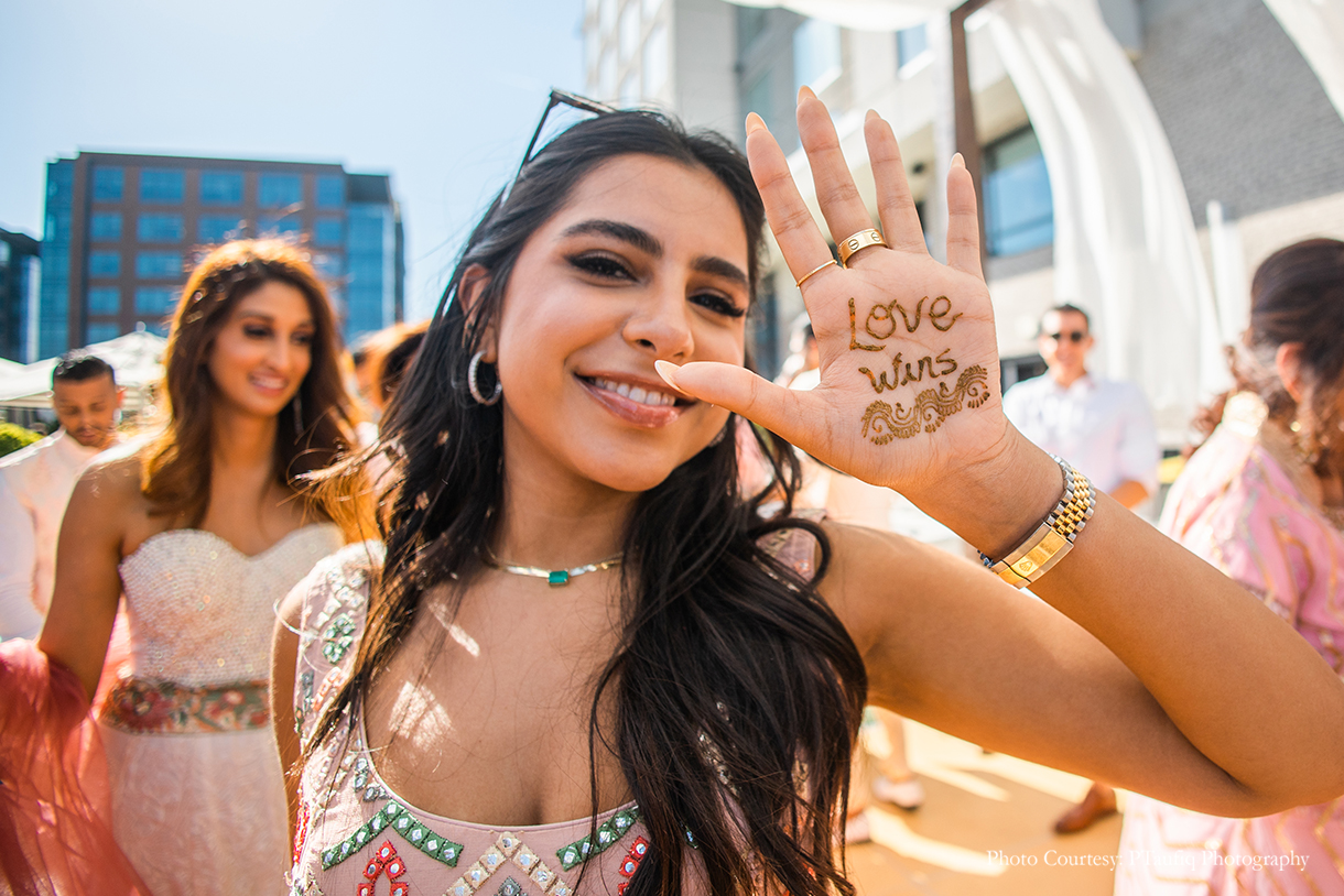 Amrit shares, “The dress code for mehndi was off-white, blush and pink hues, The rooftop venue gave us plenty of opportunity to enjoy the sunny day as we got henna patterned on our palms. The colorful floral decor reflected the cheery mood of the event.”