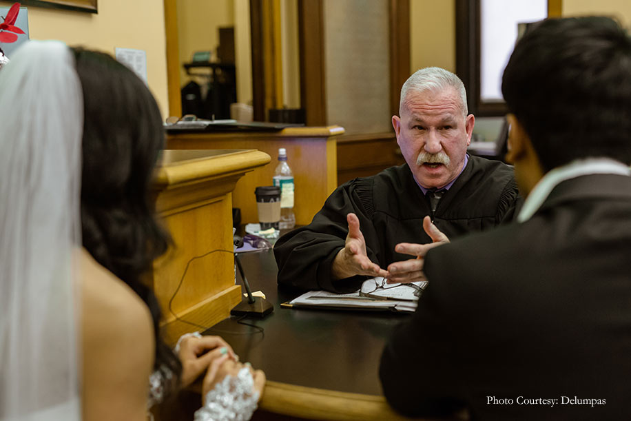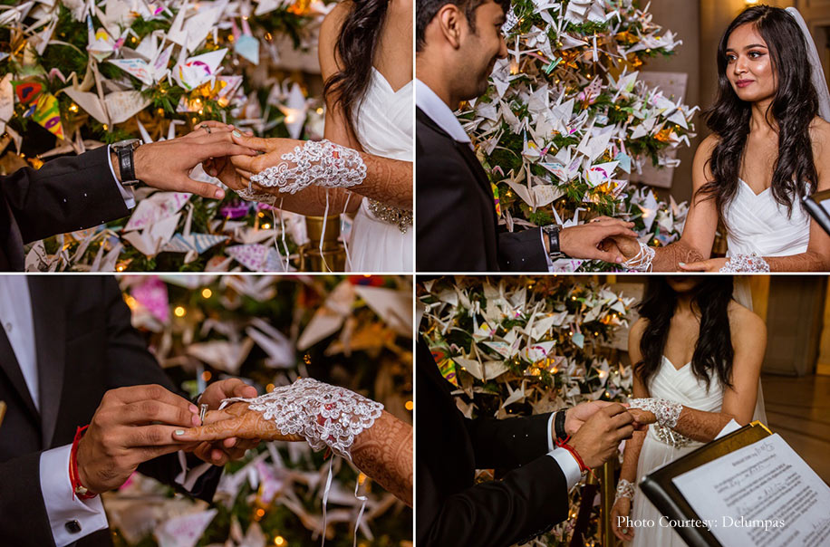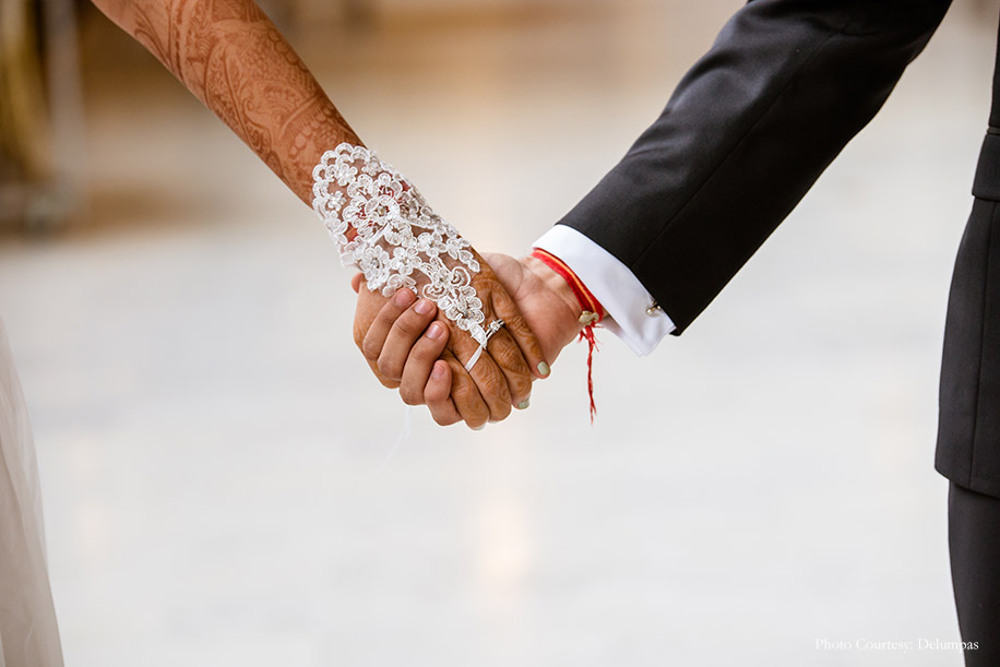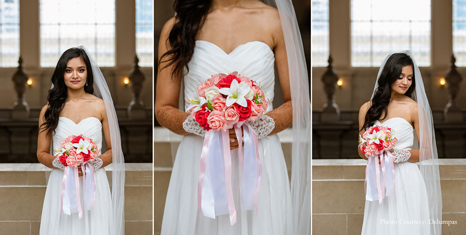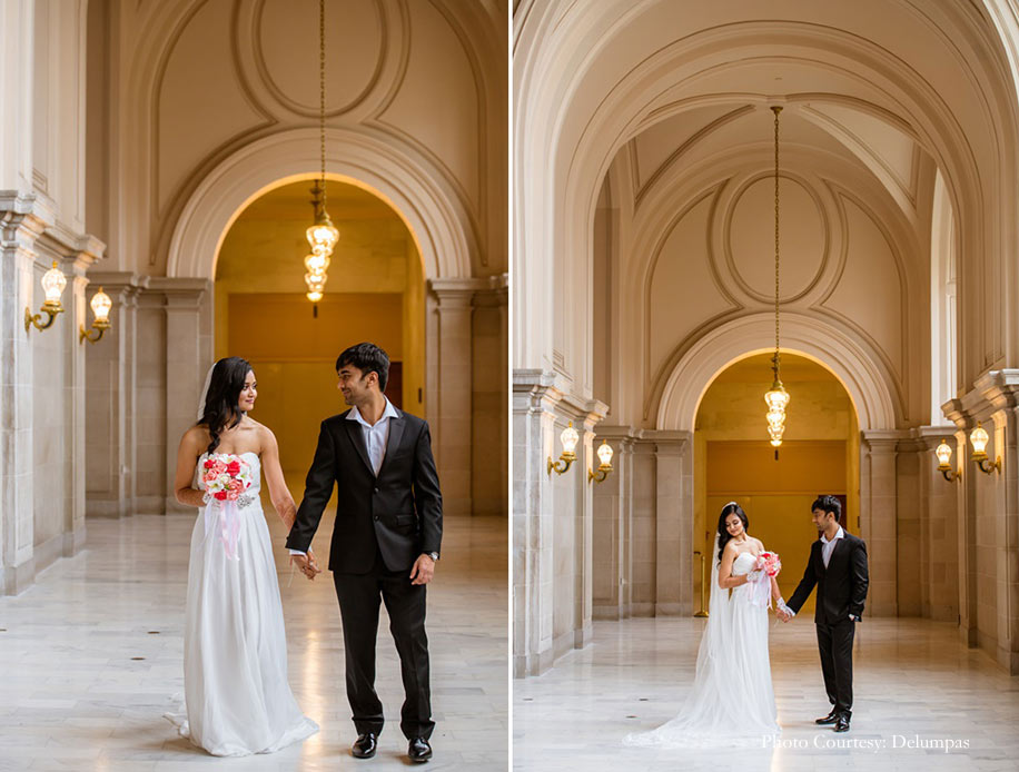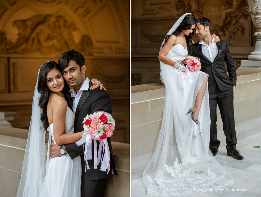 Raj and Ankita went for a white wedding theme for their US wedding celebrations. She wore a beautiful white gown and he wore a black suit with a white shirt. They posed against the magnificent ramparts of the City Hall with its imposing structures and beautiful arches. Ankita’s beautiful ensemble came with a delicate net train and she wore beautifully crafted wrist-length lace gloves. Her pretty bouquet of red, pink and white blooms added a touch of color to the proceedings. The couple went in for a colorful and vibrant Indian nuptials back home in New Delhi which was attended by a large gathering of their family members and friends.