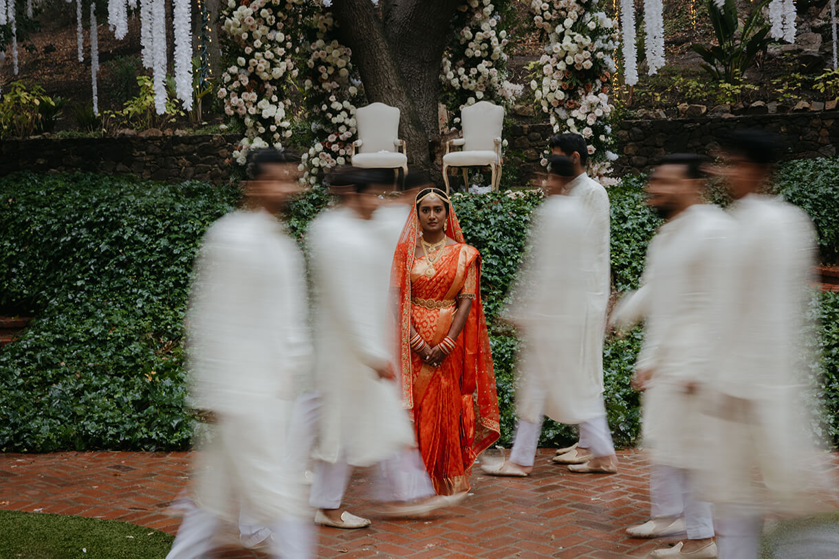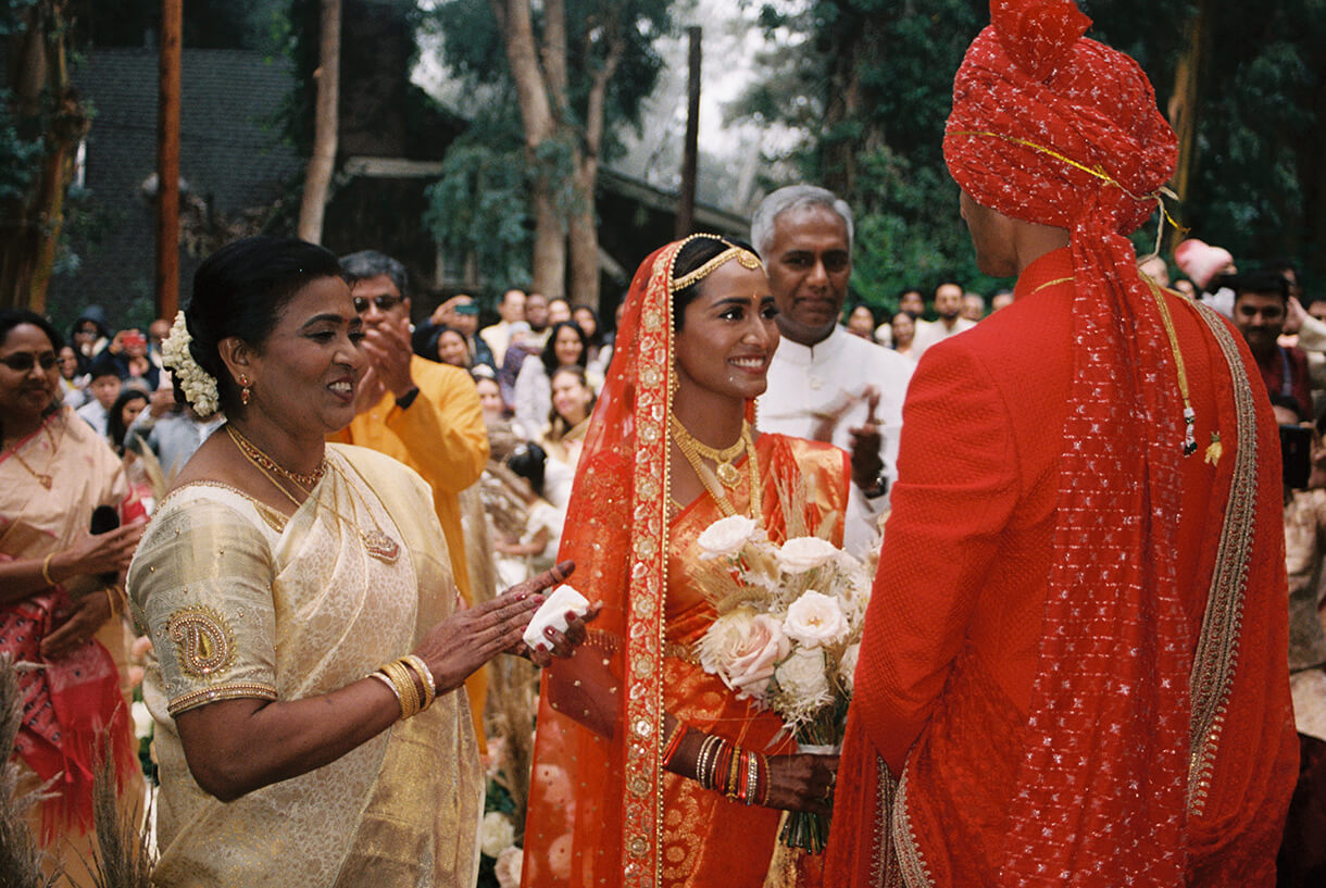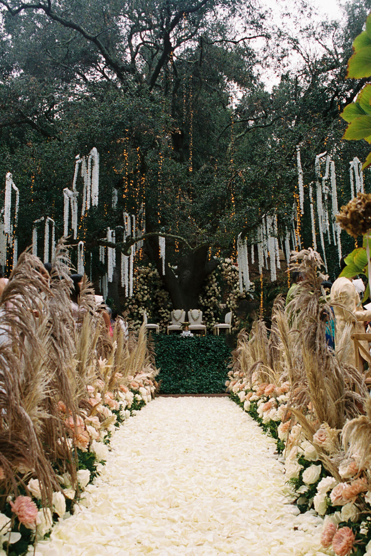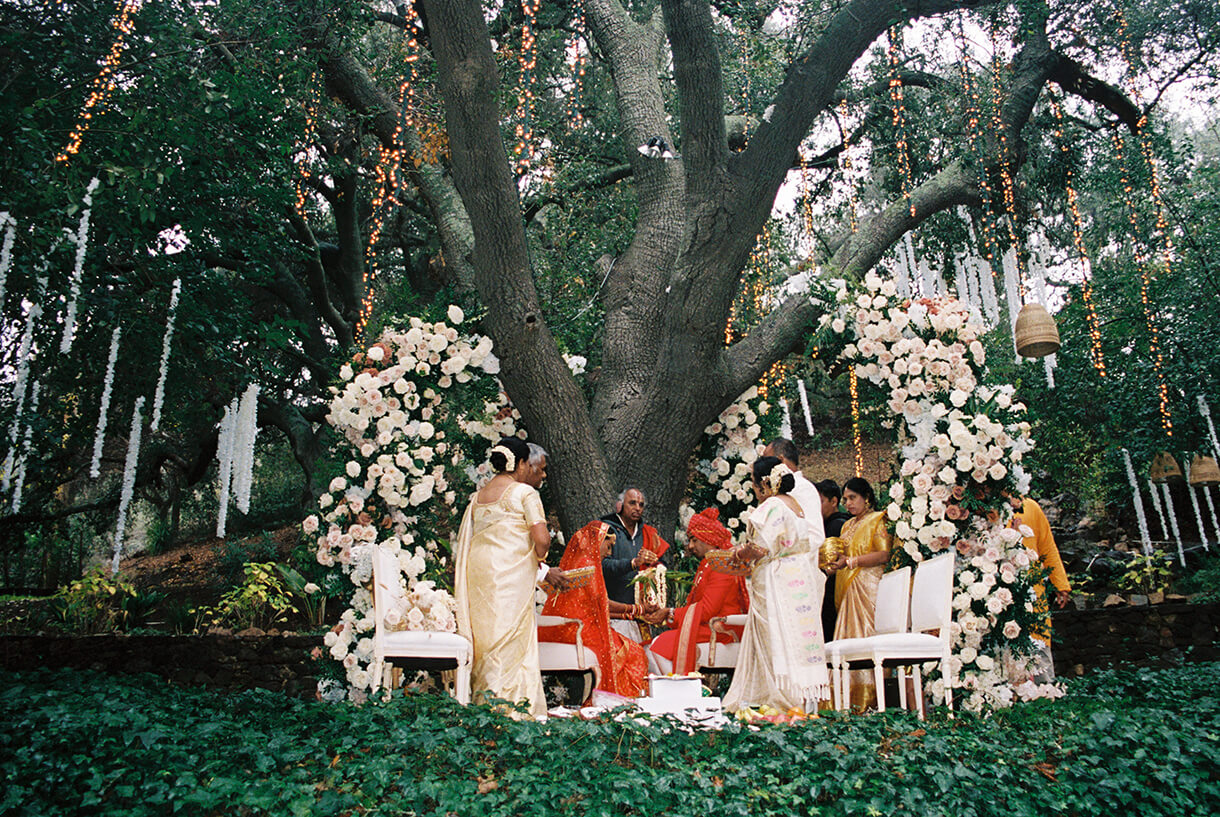 Anusha shares, “I had always wanted an outdoor wedding ceremony, and the huge tree at Calamigos Ranch as a focal point, the enveloping lushness all around, was a dream come true. With no boxed structure, we kept the mandap as organic and open as possible with pillars of roses and leaves leading up to the tree, as the cascading branches and leaves of the tree hung above us, along with strings of delicate flowers. The aisle was also lined with flowers and pampas, and filled with petals for a truly enchanting ambiance. The soft neutral hues aligned beautifully with the serene, natural feel of the occasion while allowing our red outfits to pop! Being the romantic that I am, my surprise for the ceremony was an audio note that I had recorded for Deek, which played as I walked down the aisle with my parents. It was a beautiful and emotional moment for both of us, not to mention our friends who have been waiting for our love story to manifest since we were 18.”
