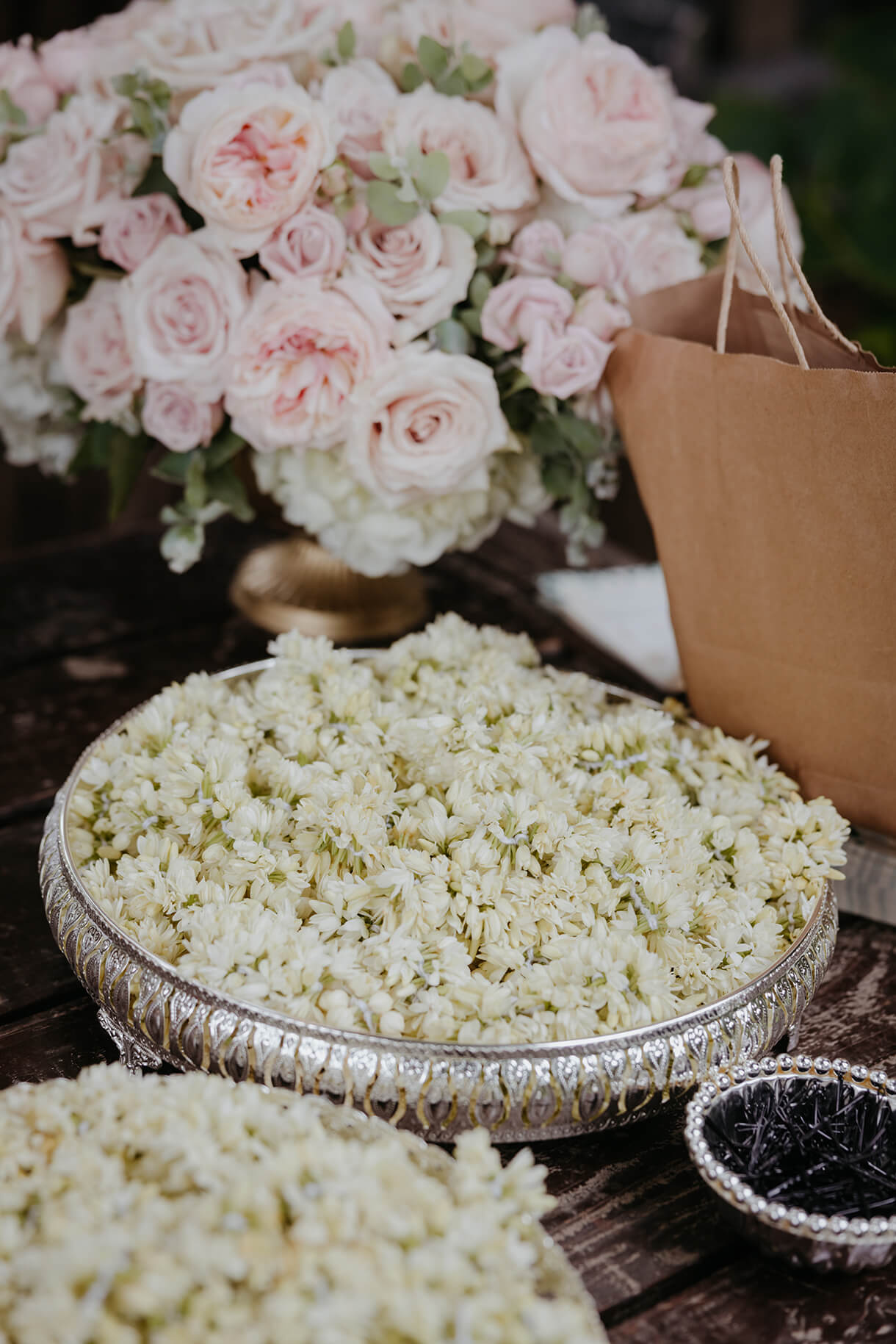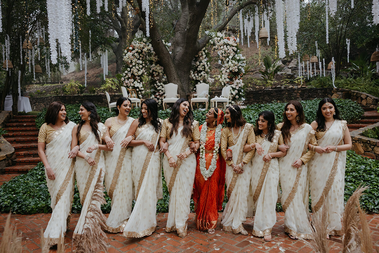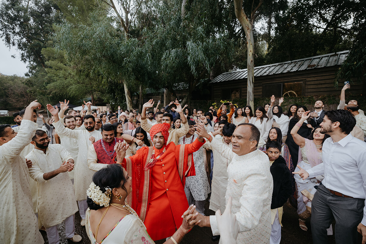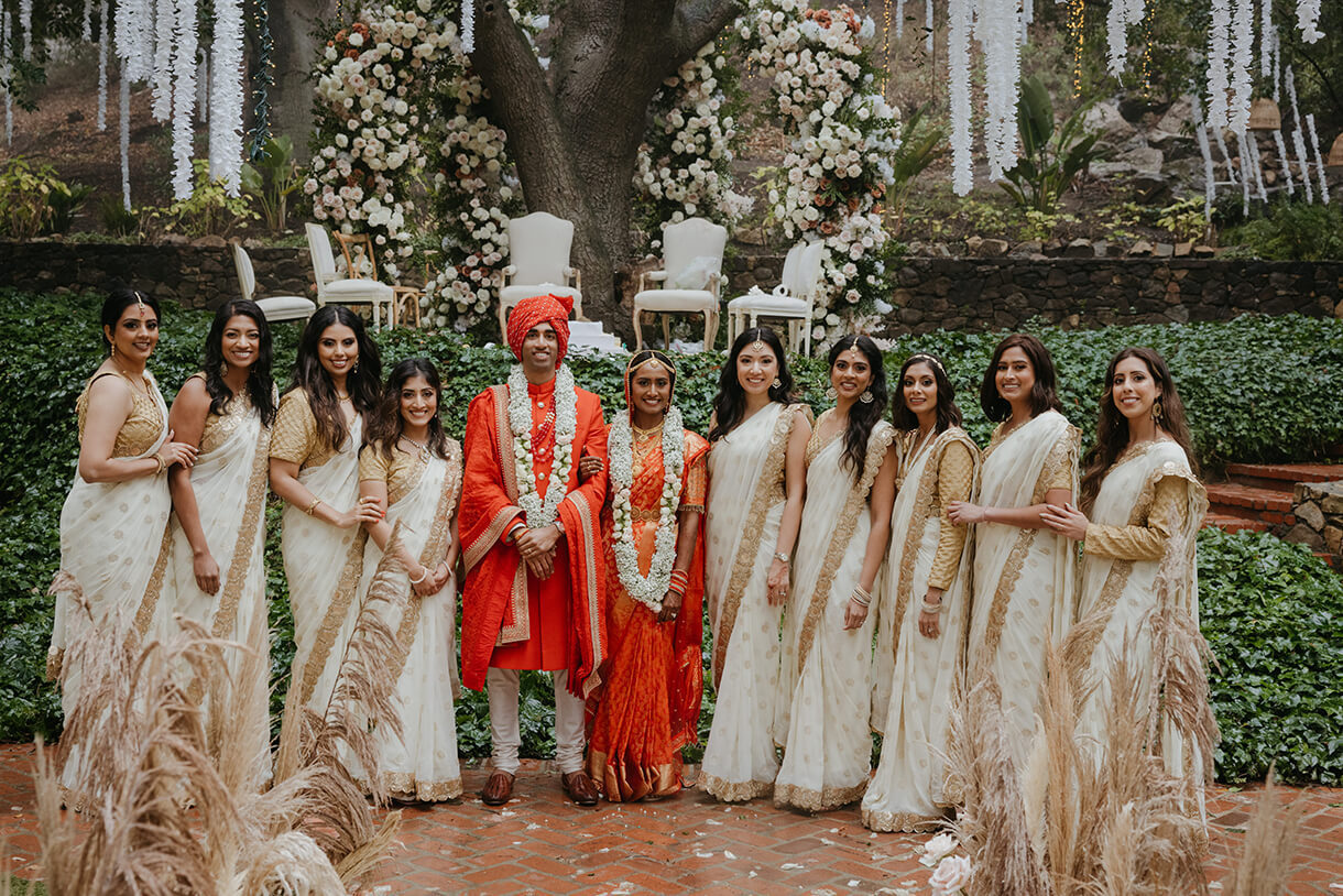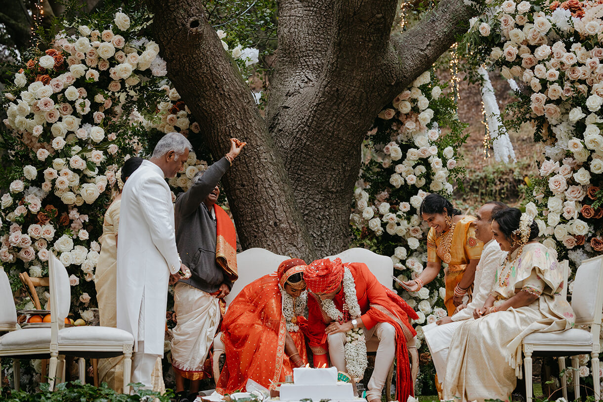 Anusha shares, “I had always wanted an outdoor wedding ceremony, and the huge tree at Calamigos Ranch as a focal point, the enveloping lushness all around, was a dream come true. With no boxed structure, we kept the mandap as organic and open as possible with pillars of roses and leaves leading up to the tree, as the cascading branches and leaves of the tree hung above us, along with strings of delicate flowers. The aisle was also lined with flowers and pampas, and filled with petals for a truly enchanting ambiance. The soft neutral hues aligned beautifully with the serene, natural feel of the occasion while allowing our red outfits to pop! Being the romantic that I am, my surprise for the ceremony was an audio note that I had recorded for Deek, which played as I walked down the aisle with my parents. It was a beautiful and emotional moment for both of us, not to mention our friends who have been waiting for our love story to manifest since we were 18.”