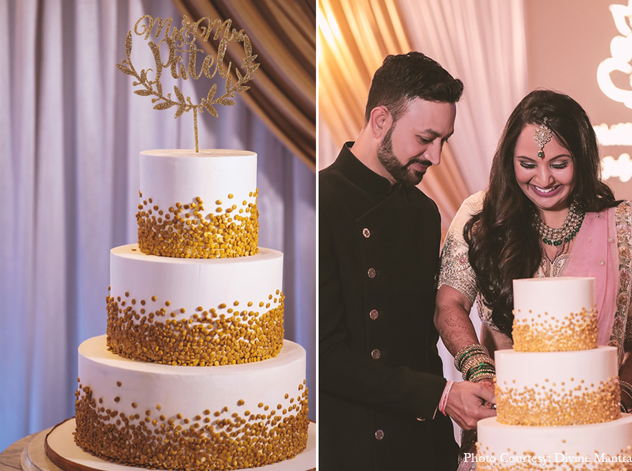 “The look and feel of everything at the reception, right from our clothes to the decor, was very modern. White drapes and fairy lights were used to decorate the ceiling while crystal flowers and branches served as table centerpieces. We went with a white and golden wedding cake that was in line with the elegant setup. For this function, I wore a cream and pink lehenga and Vaibhav wore a contemporary black sherwani.”