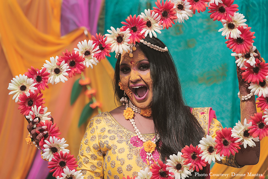 “Lots of bright colors were incorporated into our setup for the haldi, and we made use of vibrant drapes too. At the photo booth, we had a frame made of fresh flowers for our guests to pose with and have fun. I wore a yellow lehenga which I paired with floral jewellery and Vaibhav wore a yellow kurta.”