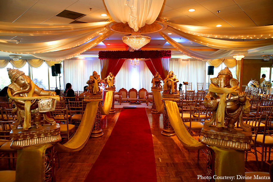 “For the wedding, we opted for very traditional Indian decor. Red and golden were the colors that were seen across all the elements of the setup. Rich drapes and lots of Ganesh idols were evocative of celebrations in India. We mixed this with fresh white flowers and fairy lights to add a subtle Western touch. I was a bride in red, and Vaibhav opted for a cream sherwani with maroon and golden details.”