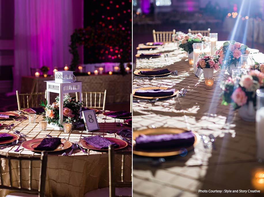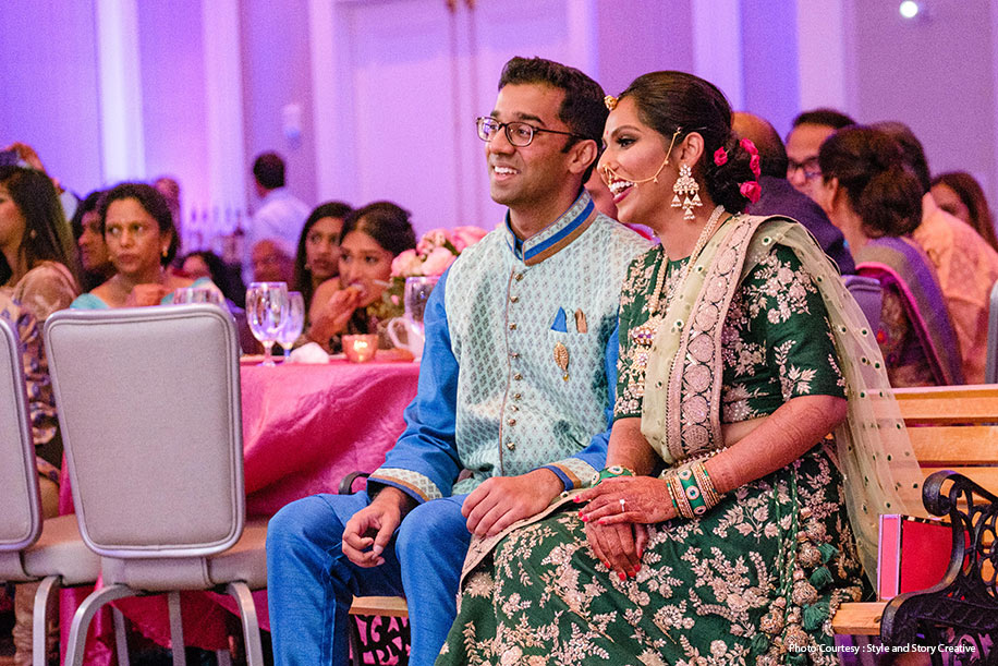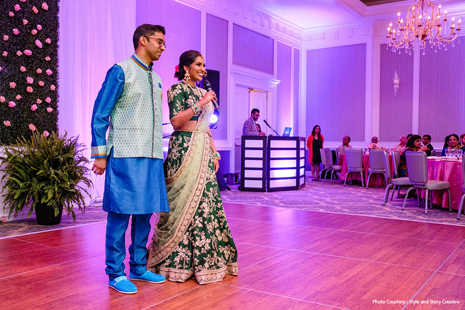 “We had a Varalakshmi pooja as well as a Gauri pooja before our sangeet in Columbus, which was attended by both sides of the family. Our cousins and friends performed multiple dances, and Navin’s mother and aunts also danced. Navin and I danced to a choreographed number. My theme for the sangeet was a garden theme with pink, lavender, and greens as the color scheme as I wanted to keep it simple and elegant. We also had a small flower wall with a park bench for Navin and me to sit at during the performances. My gorgeous sangeet lehenga was sourced from Mumbai, and I opted for a Rajasthani-style necklace in gold with pearls as accessories.”