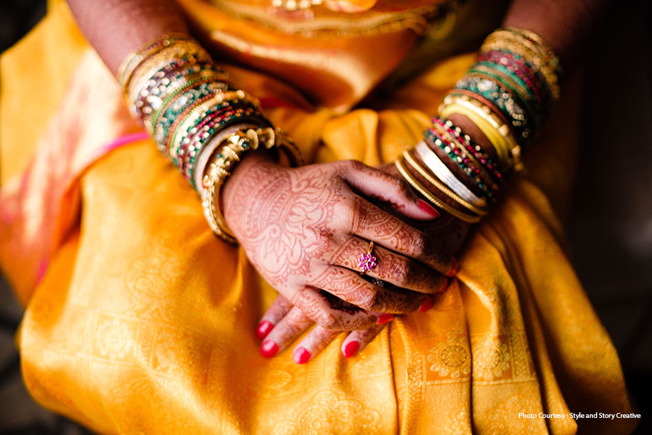 “My mother and her friends decorated the house themselves and opted for a very traditional theme with yellow and gold marigold blooms. My first function was a mehndi ceremony that lasted the whole day, and it was filled with dances and lots of food. I had my haldi function conducted in a typical Telugu fashion. We call this ceremony the ‘Pelli Kuthuru’ and it’s when the girl ‘becomes a bride.’ All our close friends, relatives and my bridesmaids were able to attend my haldi ceremony.”