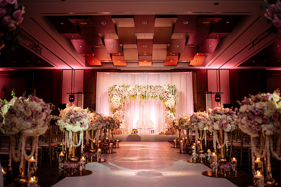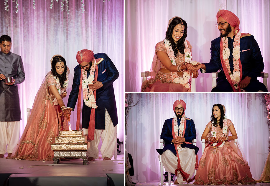 The indoor mandap was set up on a stage against a blush pink draped backdrop. Its pillars were festooned with large floral arrangements, specifically white and pink roses. Garlands of white blooms and red foliage hung down from the ceiling. Emil wore a royal blue sherwani, a lustrous peach ‘safa’ (turban) and a matching stole for the pheras.