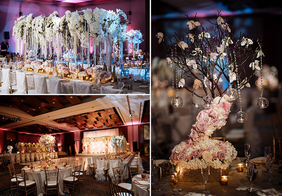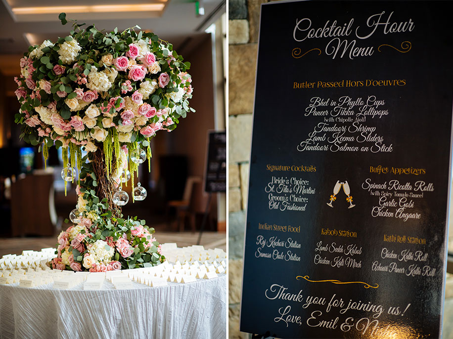 The beautiful black cocktail menu board listed signature drinks, live cooking stations and appetizer details. The decor was all about crystals strands and blooms on towering table centerpieces, from the ceiling and behind the stunning stage structure.