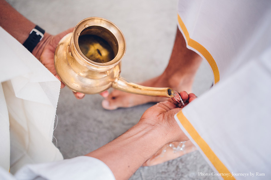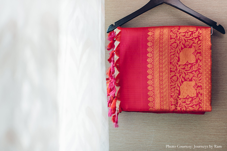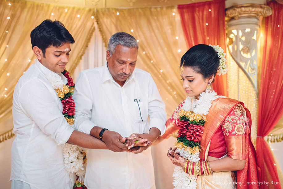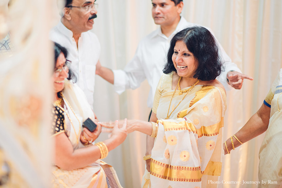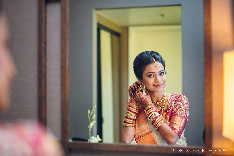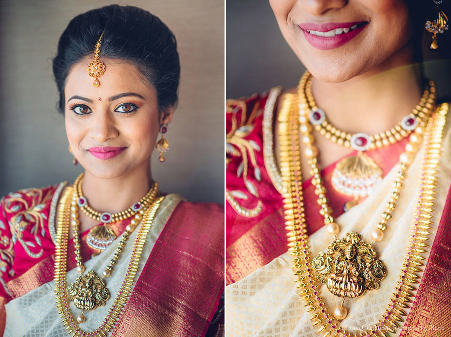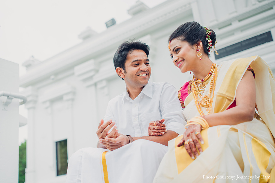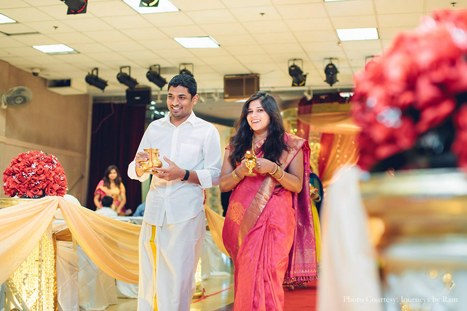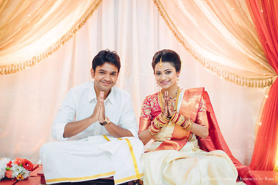 “We had envisioned our wedding decor to include a palette of gold, pink, red and ivory hues, and the reality was a spitting image of our imagination. Vivek from Ruhee Decorators understood and executed our vision to perfection. Sahil wore a white ‘mundu’ (traditional garment for men in Kerala worn around the waist) with a golden border and a white shirt while my ivory and golden Kanjivaram saree with a pink border complemented Sahil’s ensemble as well as the decor beautifully. I finished my look with some stunning temple jewellery.”