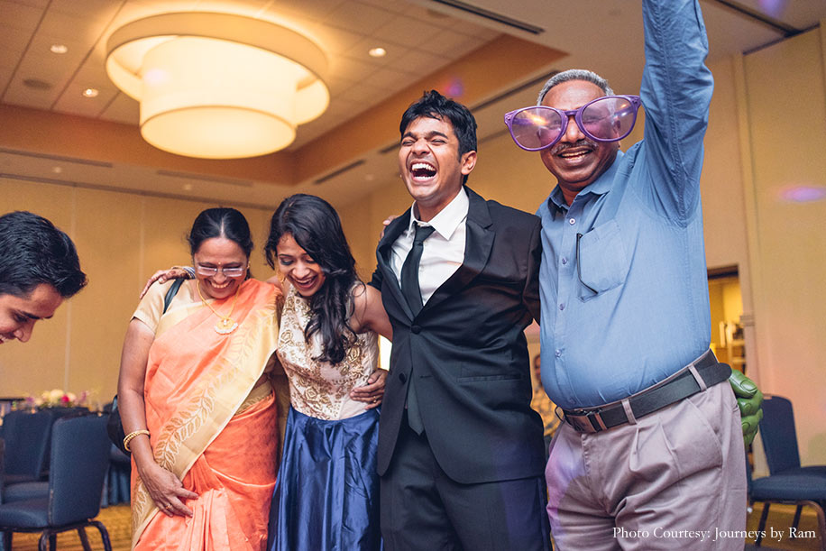 “For our reception, we booked a space at the Hyatt Regency Dulles at Herndon, Virginia. This function was a fun-filled contrast to the formal wedding that took place in the morning. Highlights of his event included our families letting loose with the craziest dance moves, quirky props, and endless laughter. I wore a gown with a golden bodice and a deep blue skirt and Sahil put on a black suit for this event.”