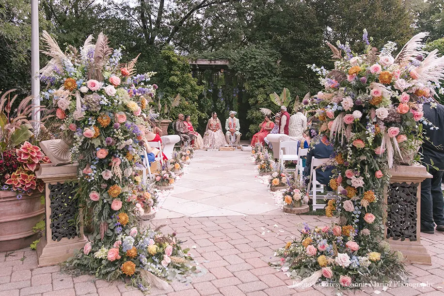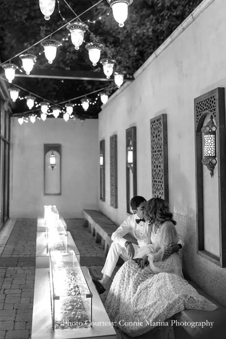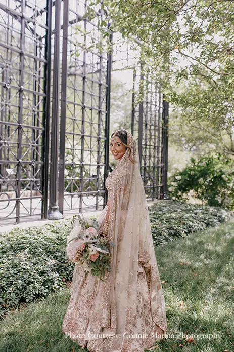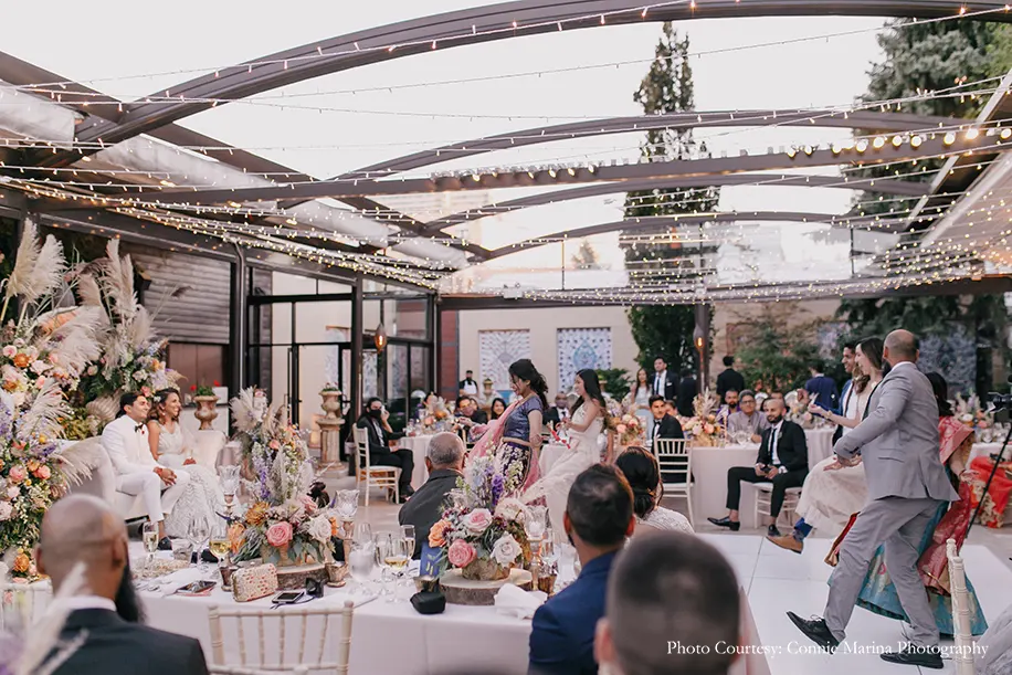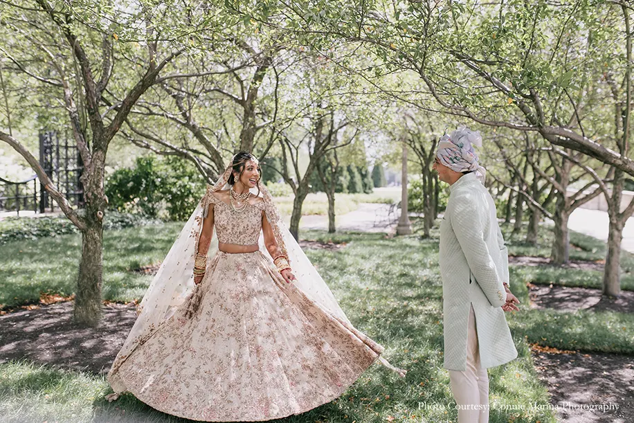 Explaining her vendor choices, the bride shares, “Abhi and I decided to step outside the norms by hiring vendors who were not necessarily from the South Asian community and represented us as a couple. First up on the list was our venue, Galleria Marchetti which was a place that wasn’t used to hosting an Indian wedding but graciously accommodated us. Next was our talented photographer Connie Maria and videographer Max who hadn’t shot an Indian wedding before. That being said, they were absolutely on point and ended up giving us memories to cherish for a lifetime. Our decorators Yianni Design Studio just knocked it out of the park with their creativity and left everyone in awe. Additionally, our dhol player Gurpreet Singh made everyone do the bhangra with his peppy beats.”