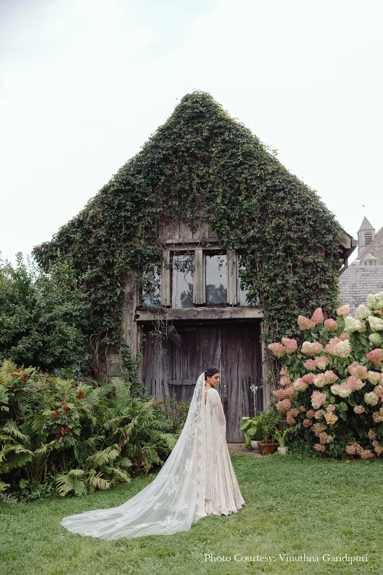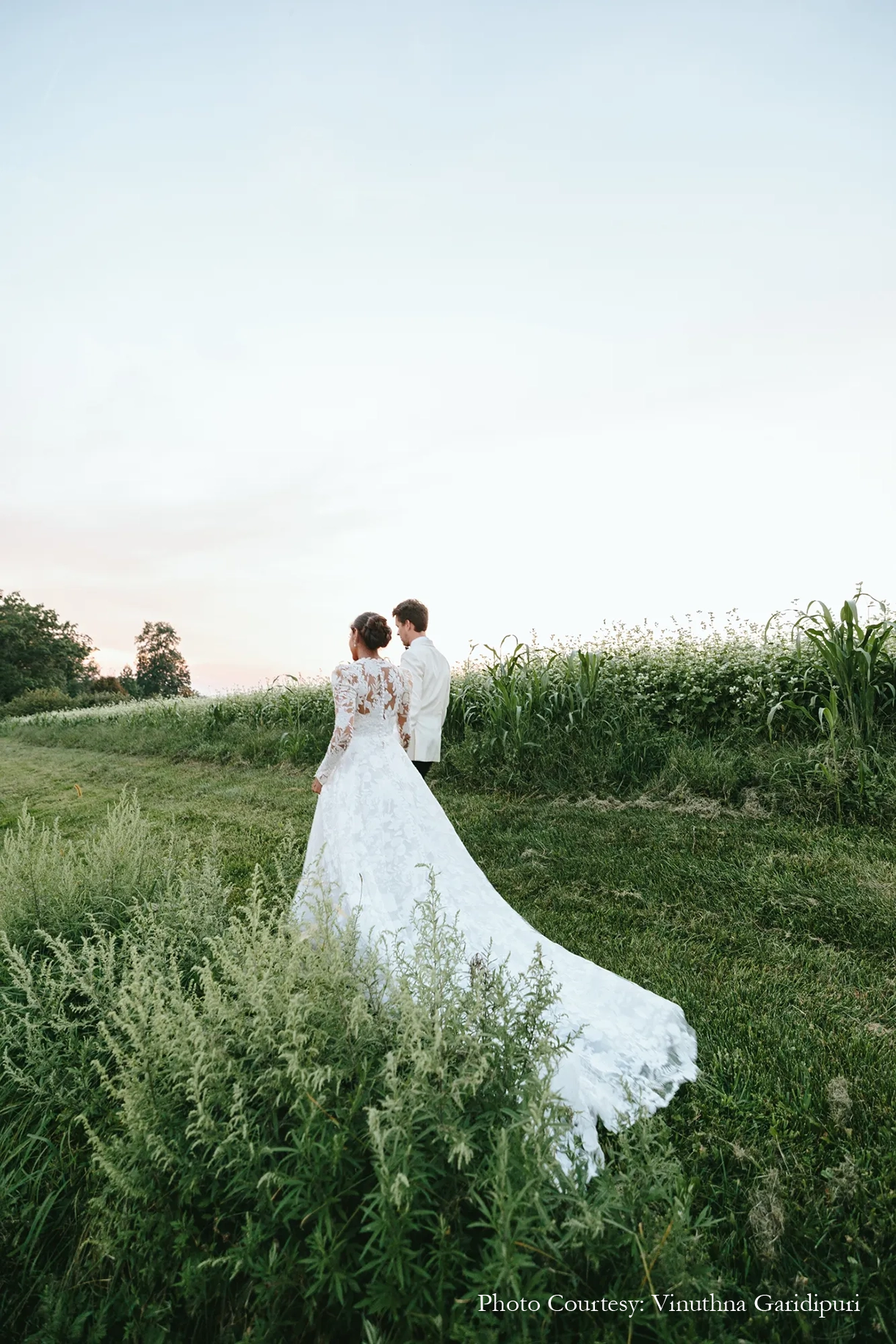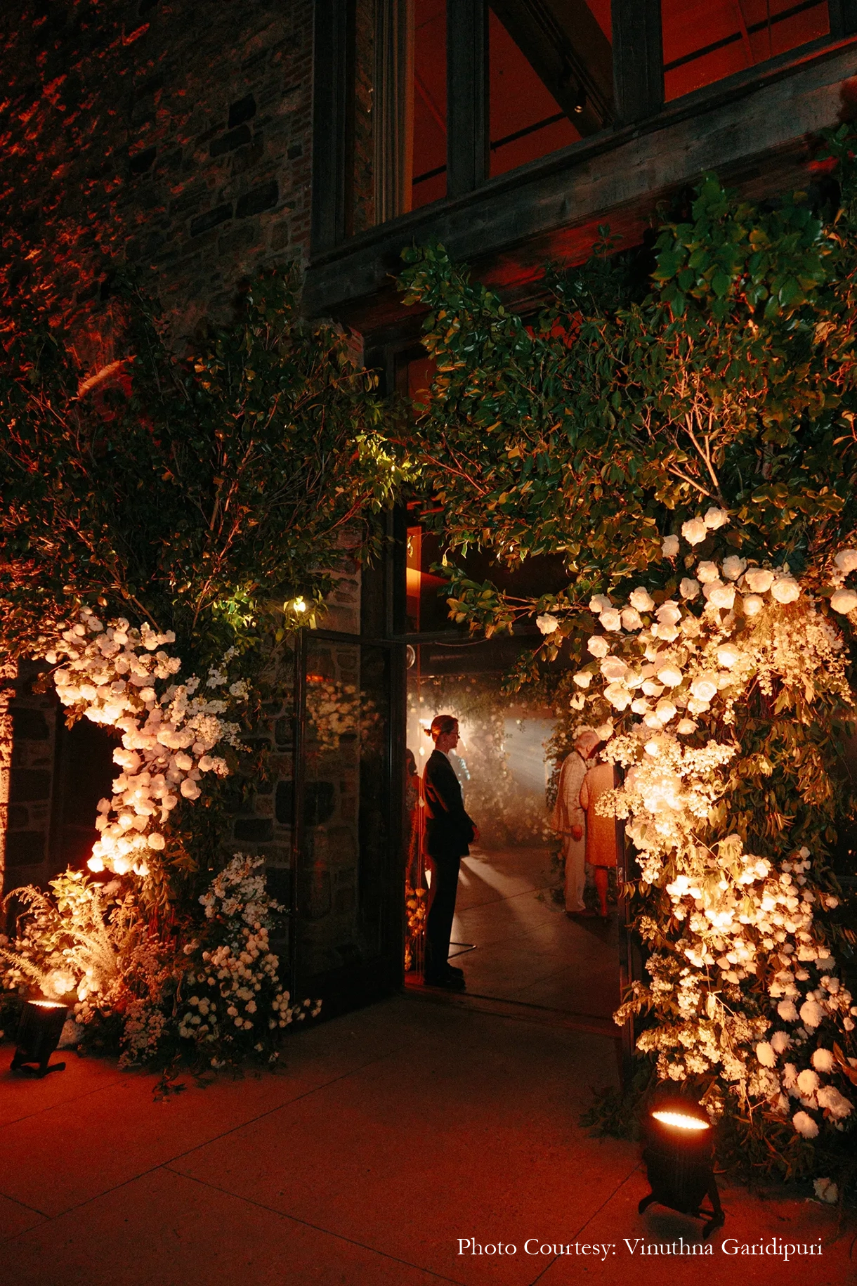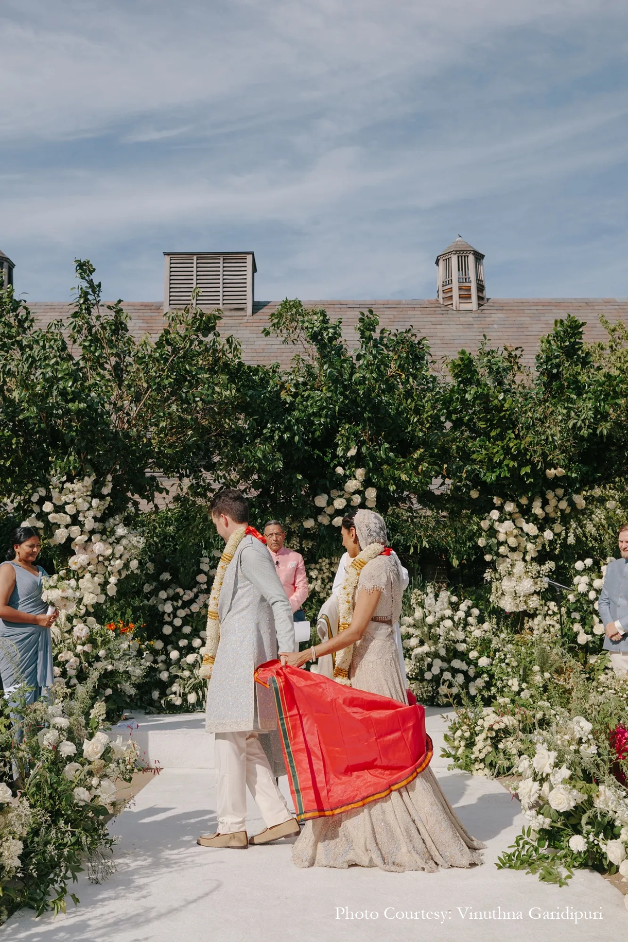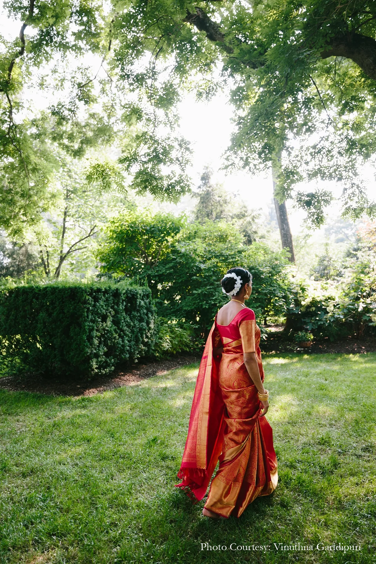 For their cross-cultural wedding celebrations, Preetha combined the best of east and west to gather a wardrobe that fit her style persona. A Tam Brahm girl at heart, she hosted a traditional Hindu wedding earlier wearing a traditional red and gold Kanchipuram silk sari sourced by her mom. As for the other bigger wedding ceremony, they chose ‘A Midsummer Night’s Dream’ theme which looked right at home amidst the July blooms and heat. Their three wedding events were hosted at the bride’s family home in Greenwich, Connecticut, the Hyatt Greenwich, and Blue Hill at Stone Barns.