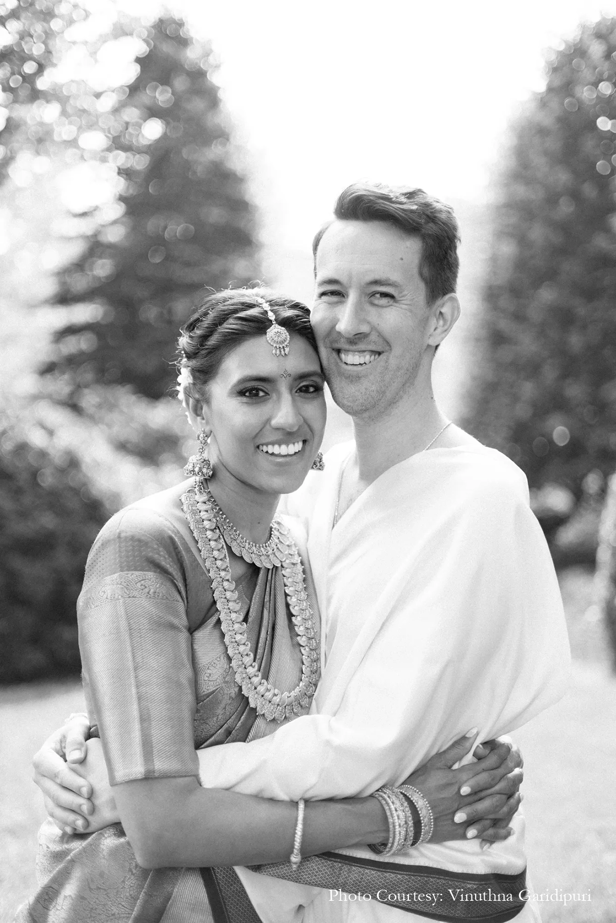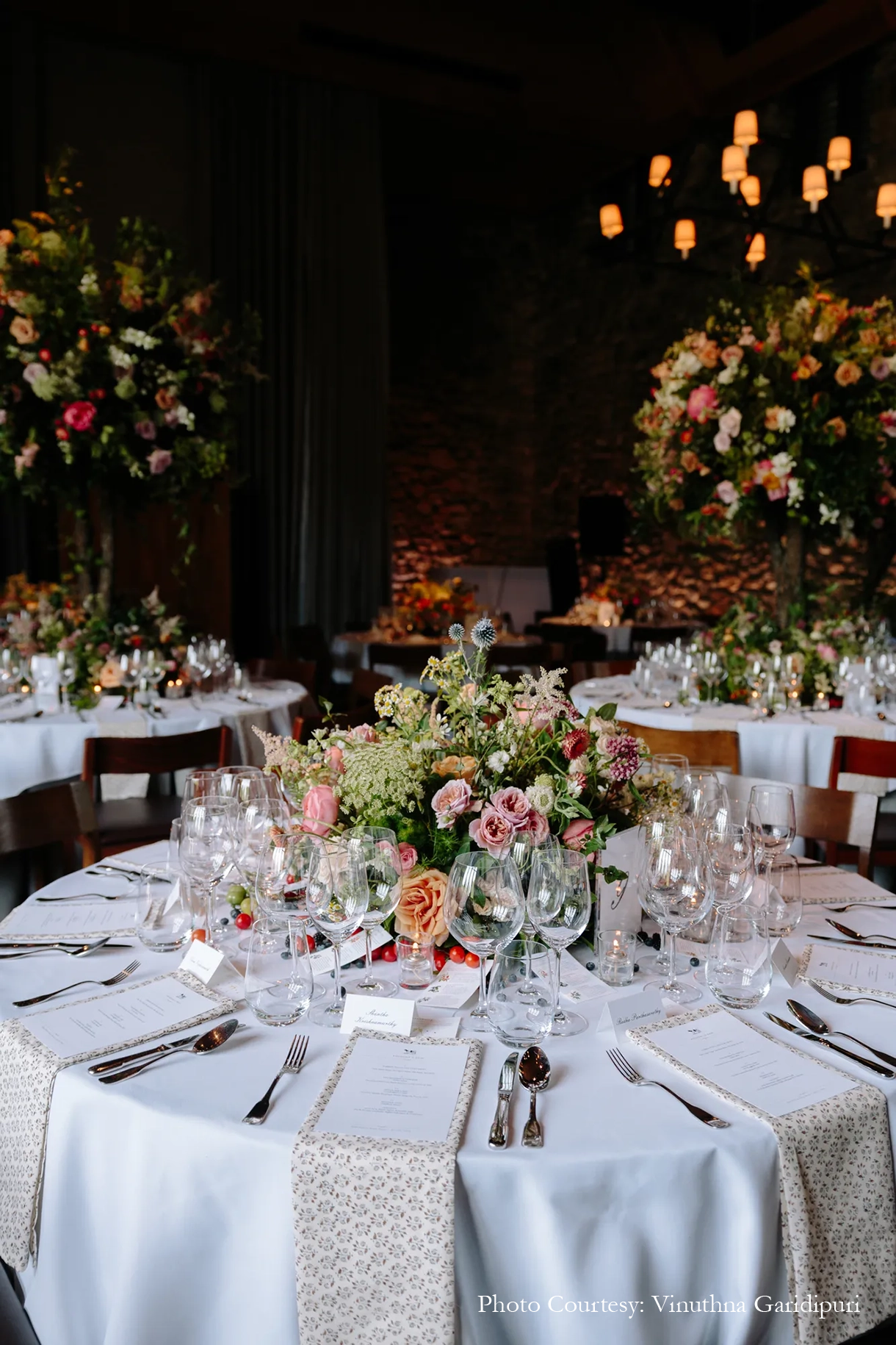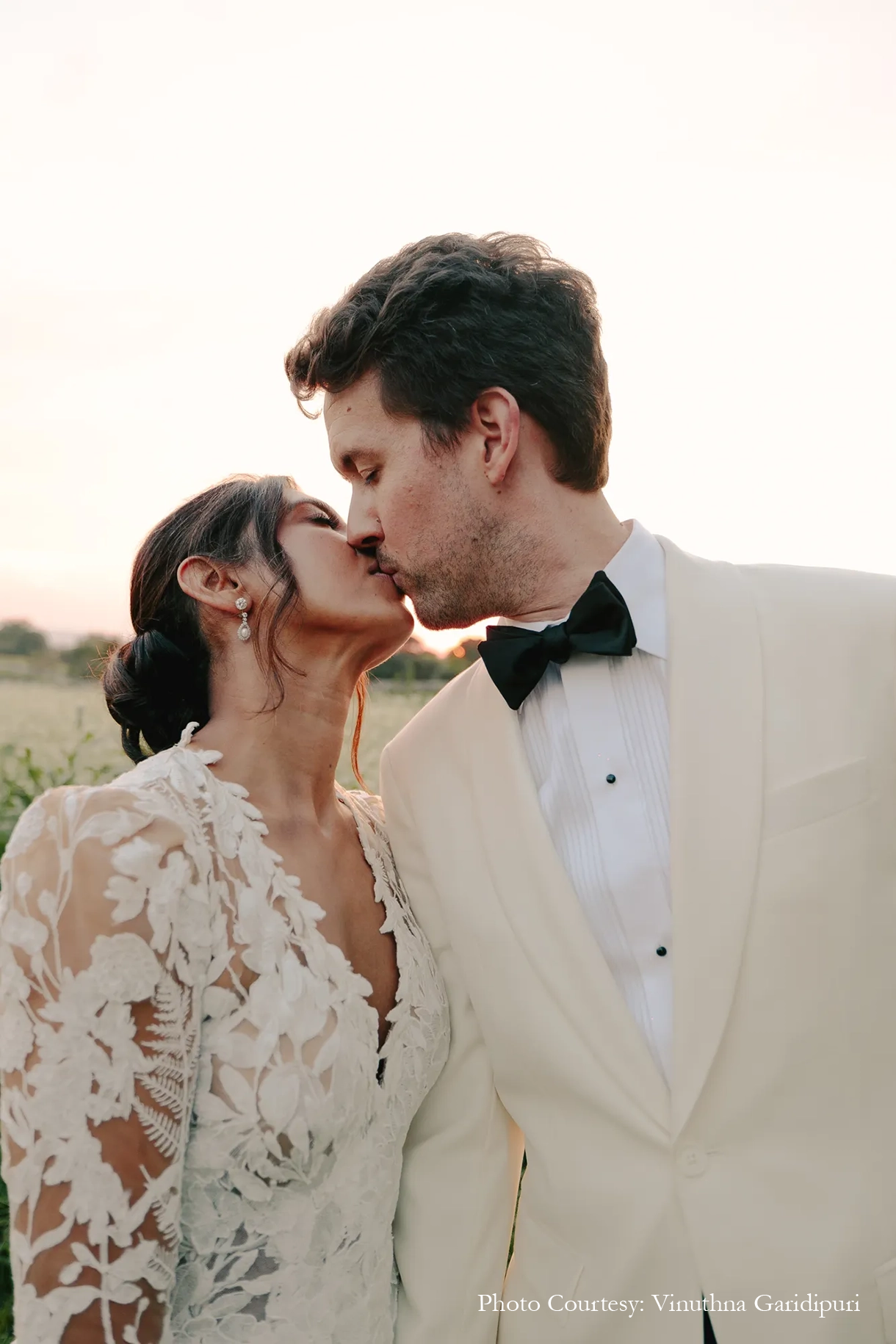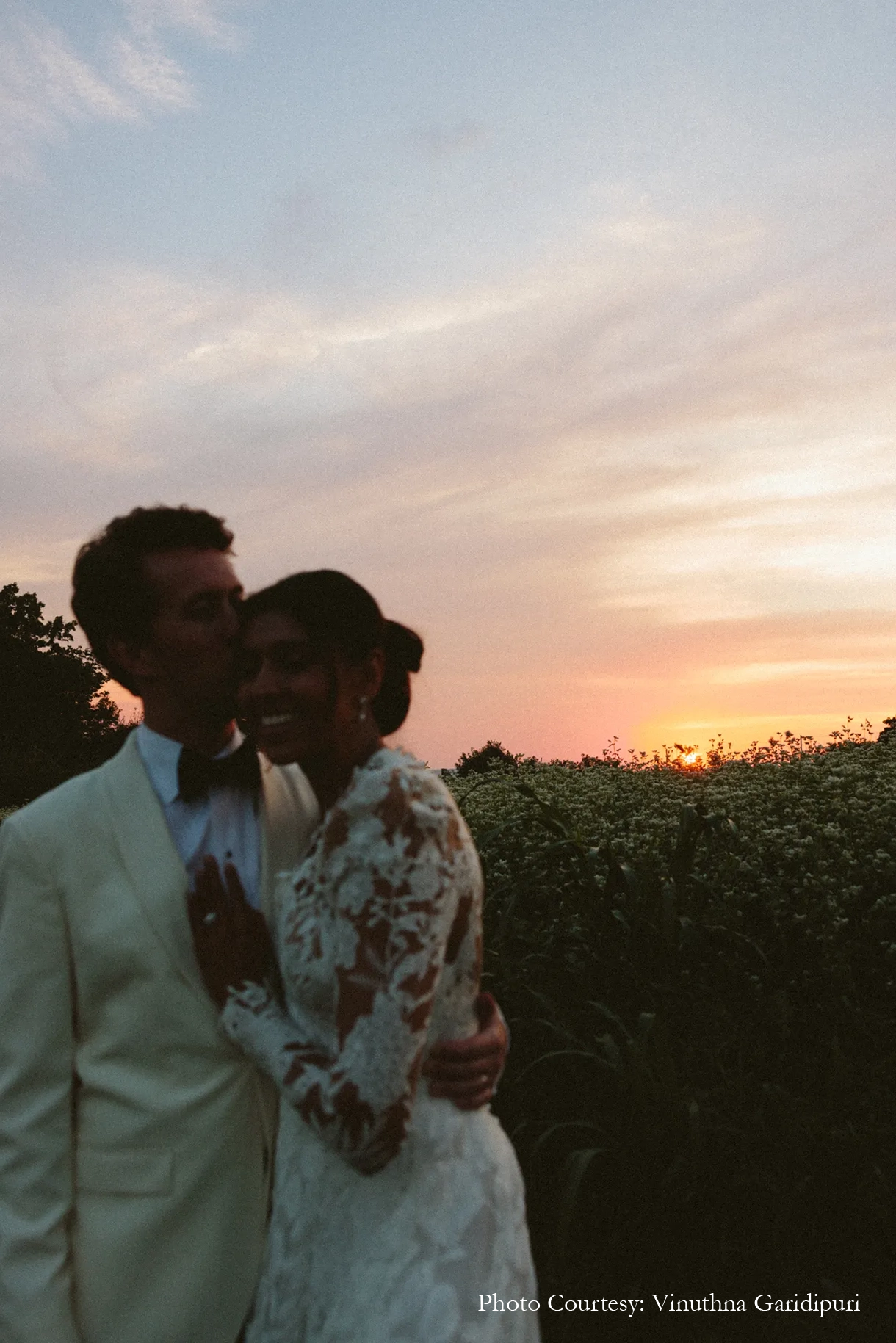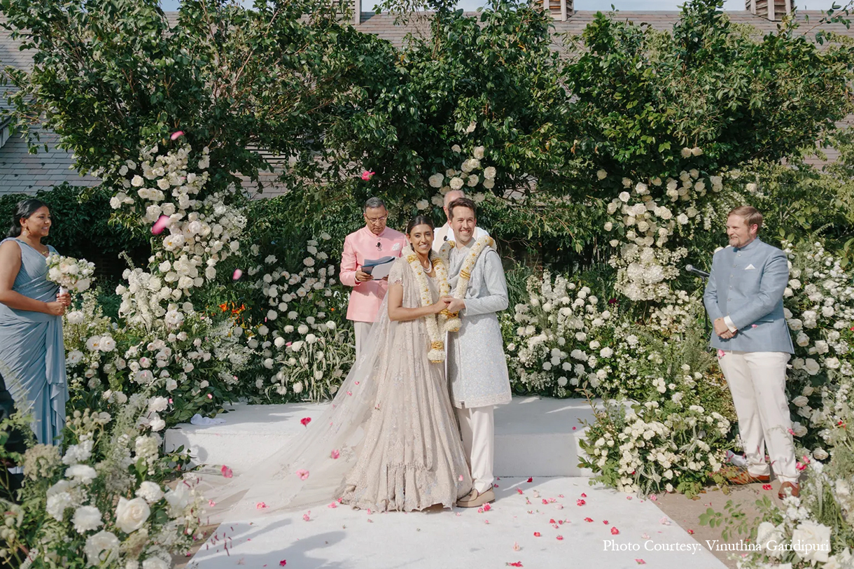 For their cross-cultural wedding celebrations, Preetha combined the best of east and west to gather a wardrobe that fit her style persona. A Tam Brahm girl at heart, she hosted a traditional Hindu wedding earlier wearing a traditional red and gold Kanchipuram silk sari sourced by her mom. As for the other bigger wedding ceremony, they chose ‘A Midsummer Night’s Dream’ theme which looked right at home amidst the July blooms and heat. Their three wedding events were hosted at the bride’s family home in Greenwich, Connecticut, the Hyatt Greenwich, and Blue Hill at Stone Barns.
