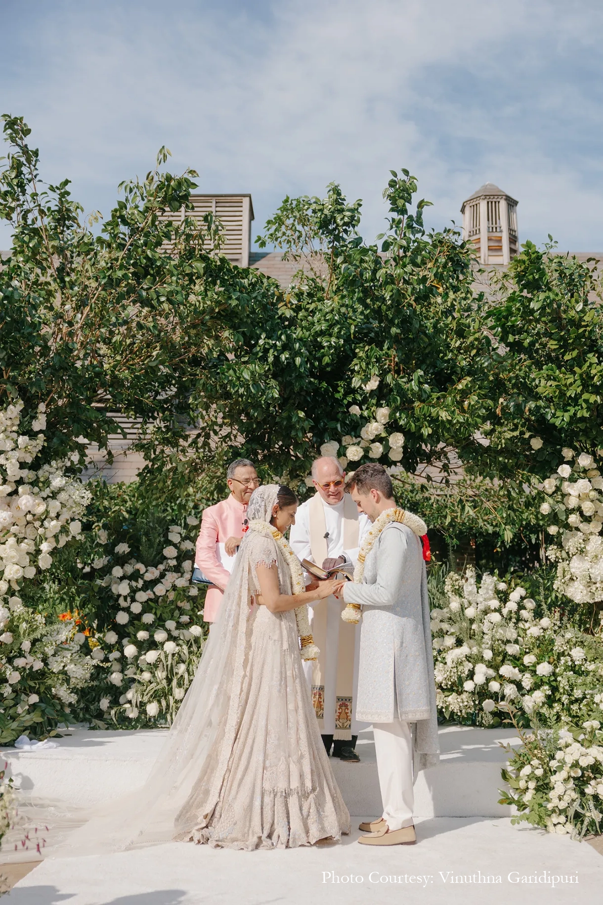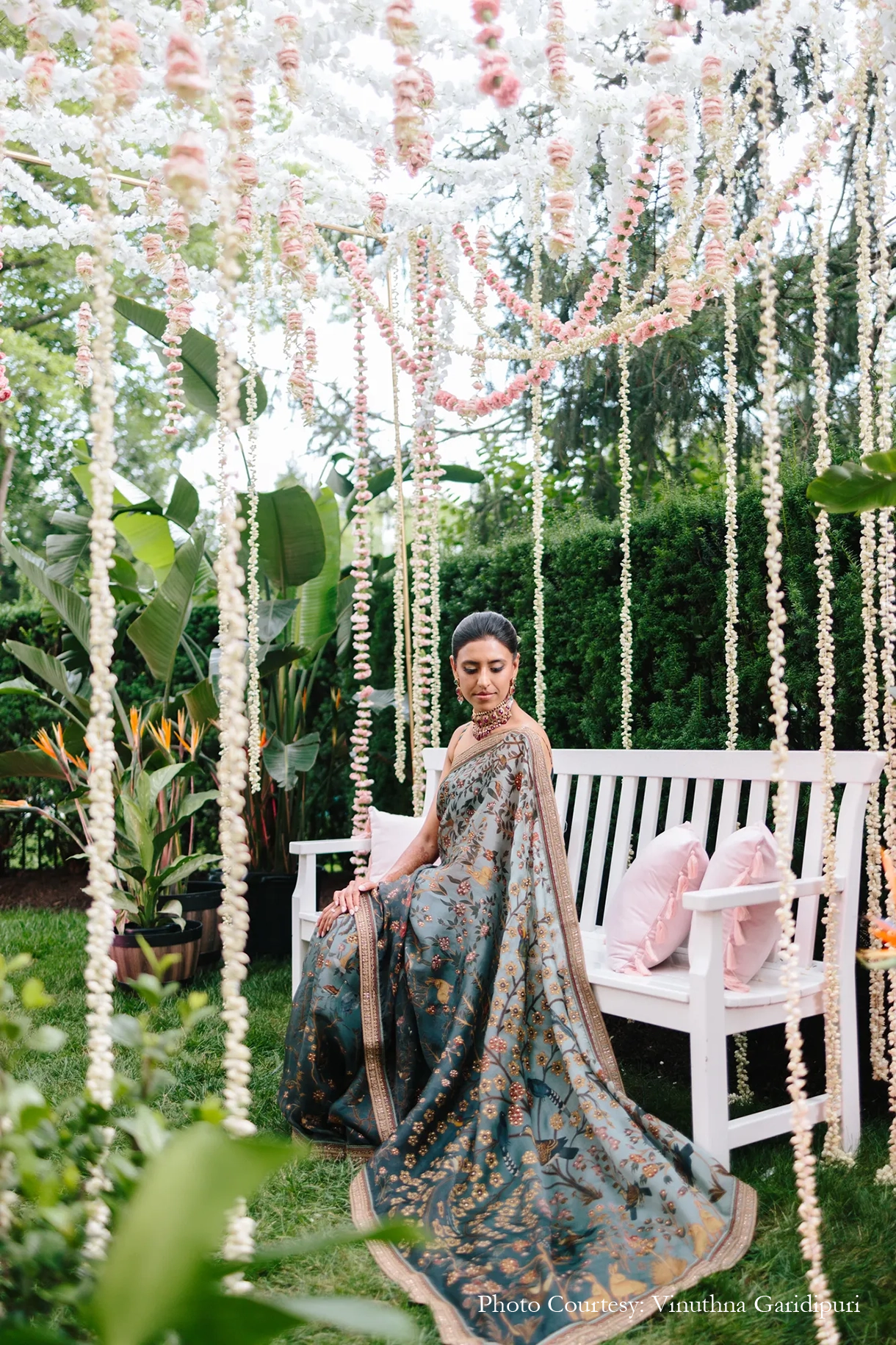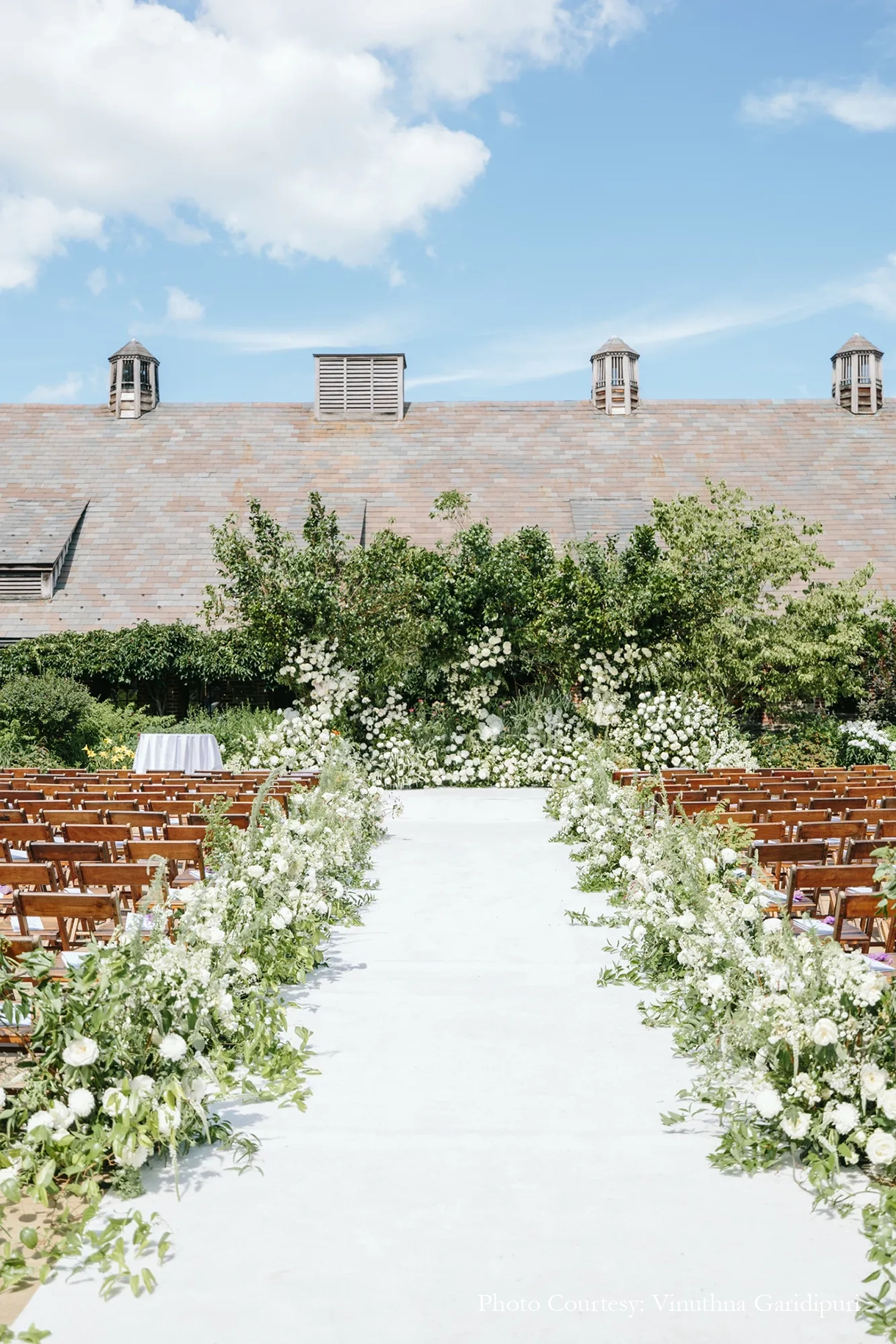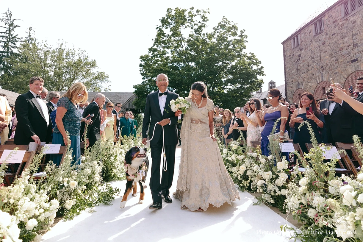 For their cross-cultural wedding celebrations, Preetha combined the best of east and west to gather a wardrobe that fit her style persona. A Tam Brahm girl at heart, she hosted a traditional Hindu wedding earlier wearing a traditional red and gold Kanchipuram silk sari sourced by her mom. As for the other bigger wedding ceremony, they chose ‘A Midsummer Night’s Dream’ theme which looked right at home amidst the July blooms and heat. Their three wedding events were hosted at the bride’s family home in Greenwich, Connecticut, the Hyatt Greenwich, and Blue Hill at Stone Barns.