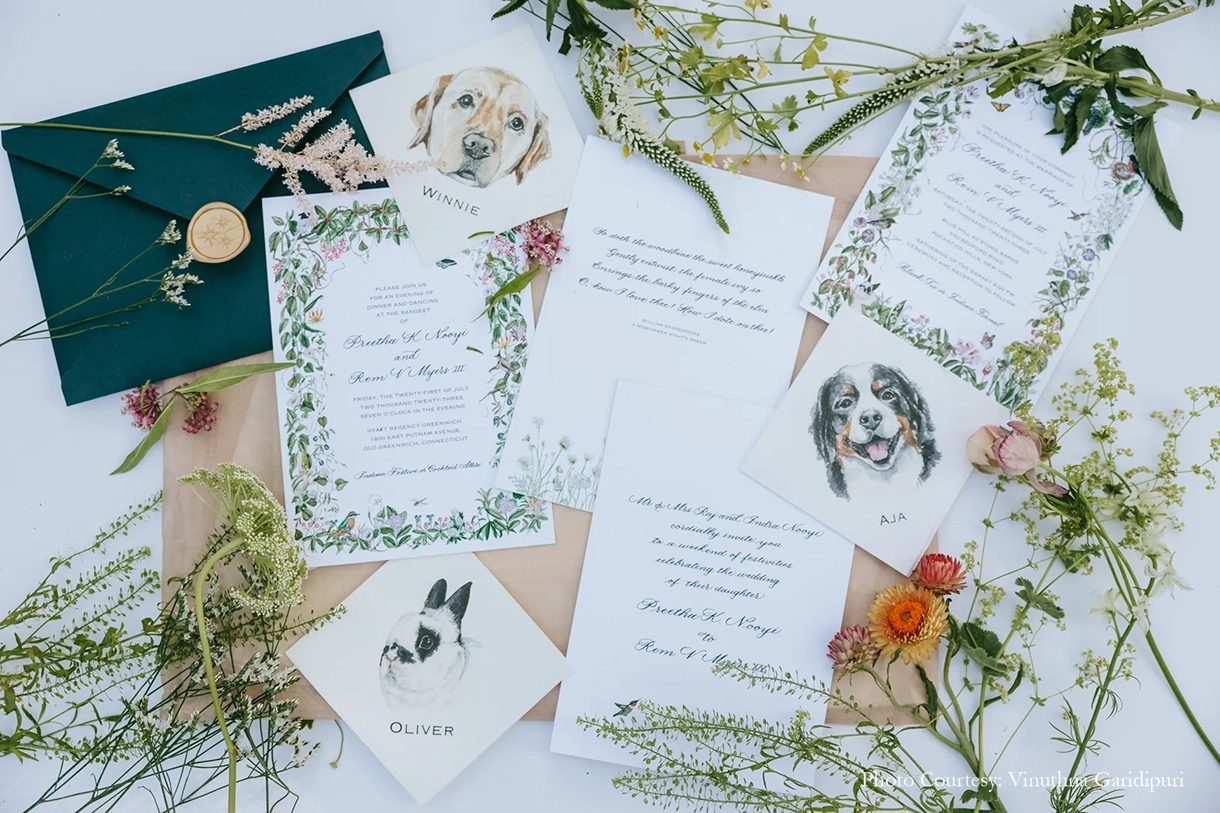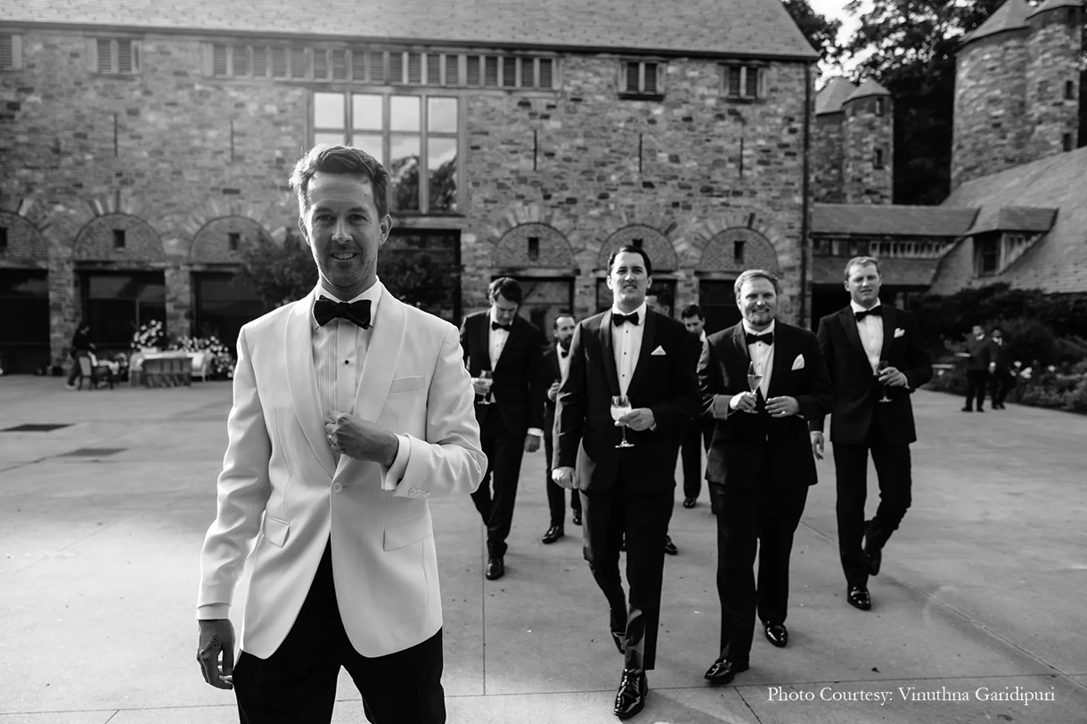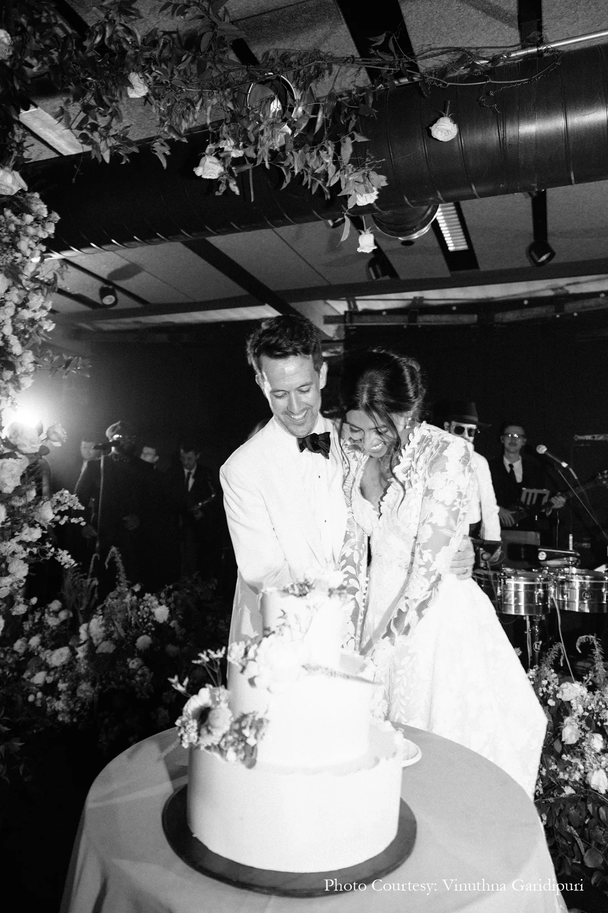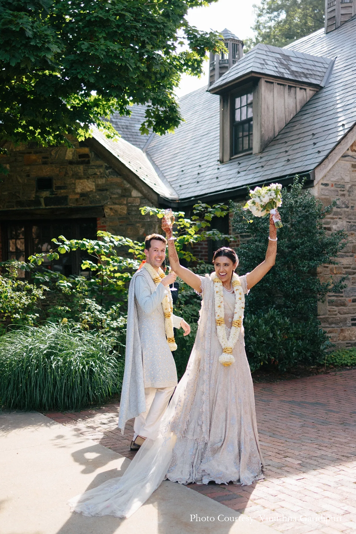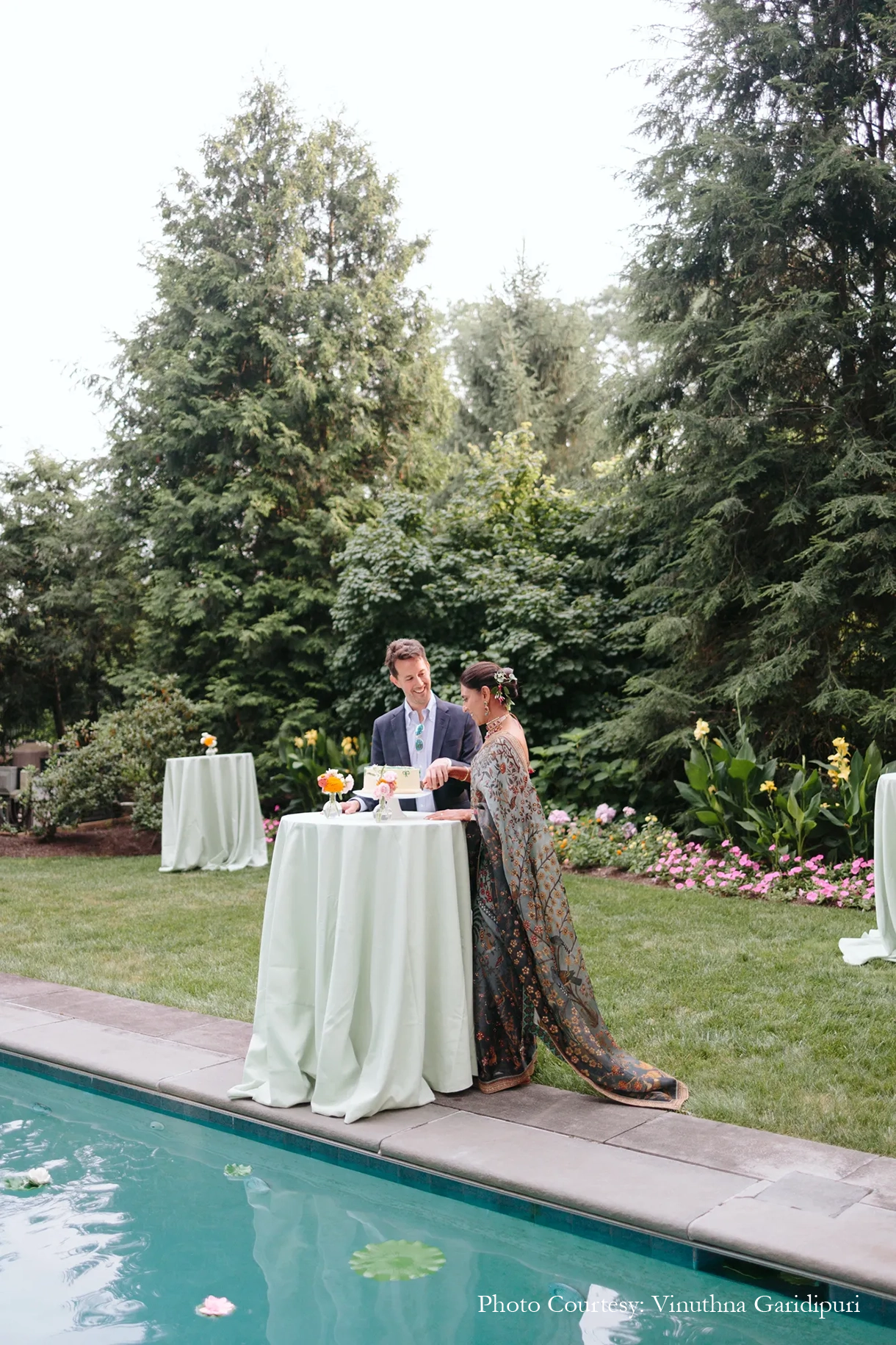 For their cross-cultural wedding celebrations, Preetha combined the best of east and west to gather a wardrobe that fit her style persona. A Tam Brahm girl at heart, she hosted a traditional Hindu wedding earlier wearing a traditional red and gold Kanchipuram silk sari sourced by her mom. As for the other bigger wedding ceremony, they chose ‘A Midsummer Night’s Dream’ theme which looked right at home amidst the July blooms and heat. Their three wedding events were hosted at the bride’s family home in Greenwich, Connecticut, the Hyatt Greenwich, and Blue Hill at Stone Barns.