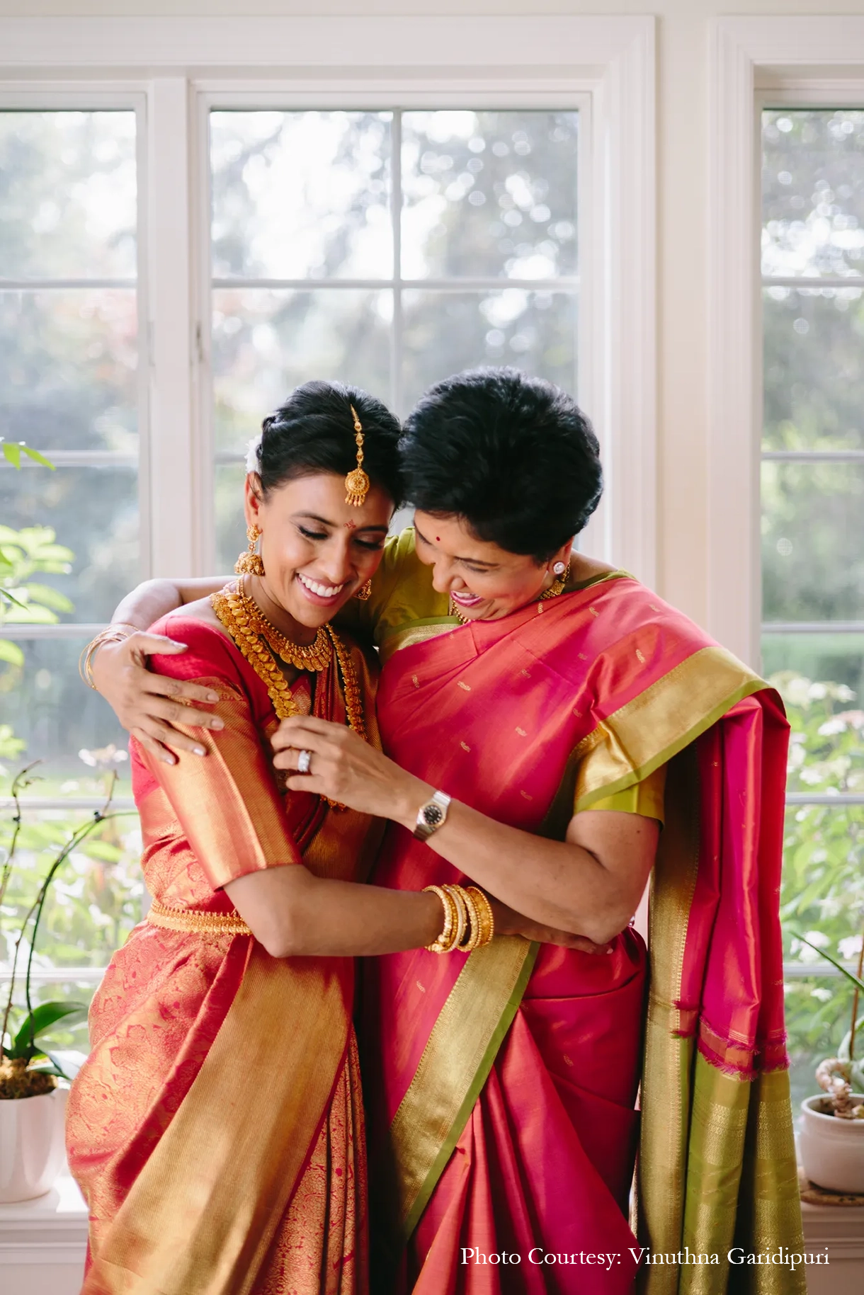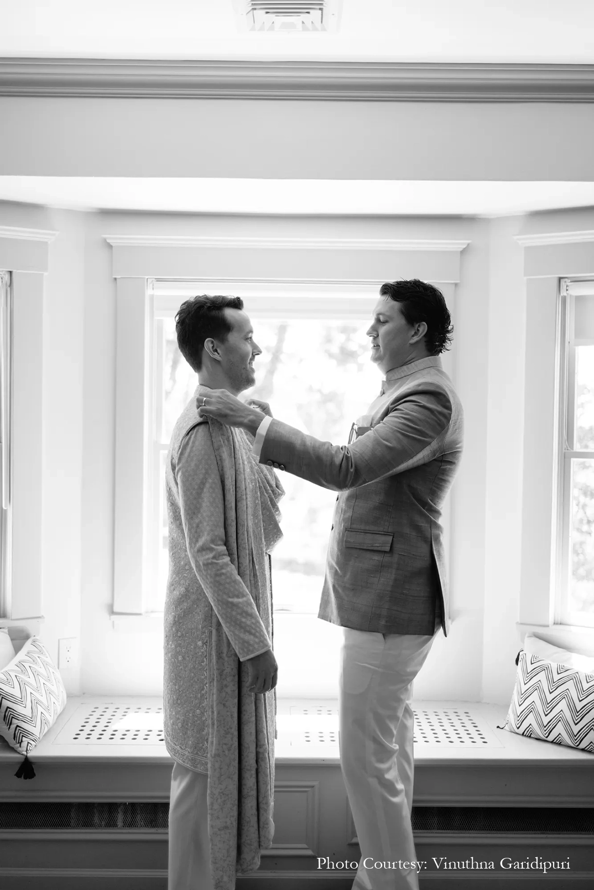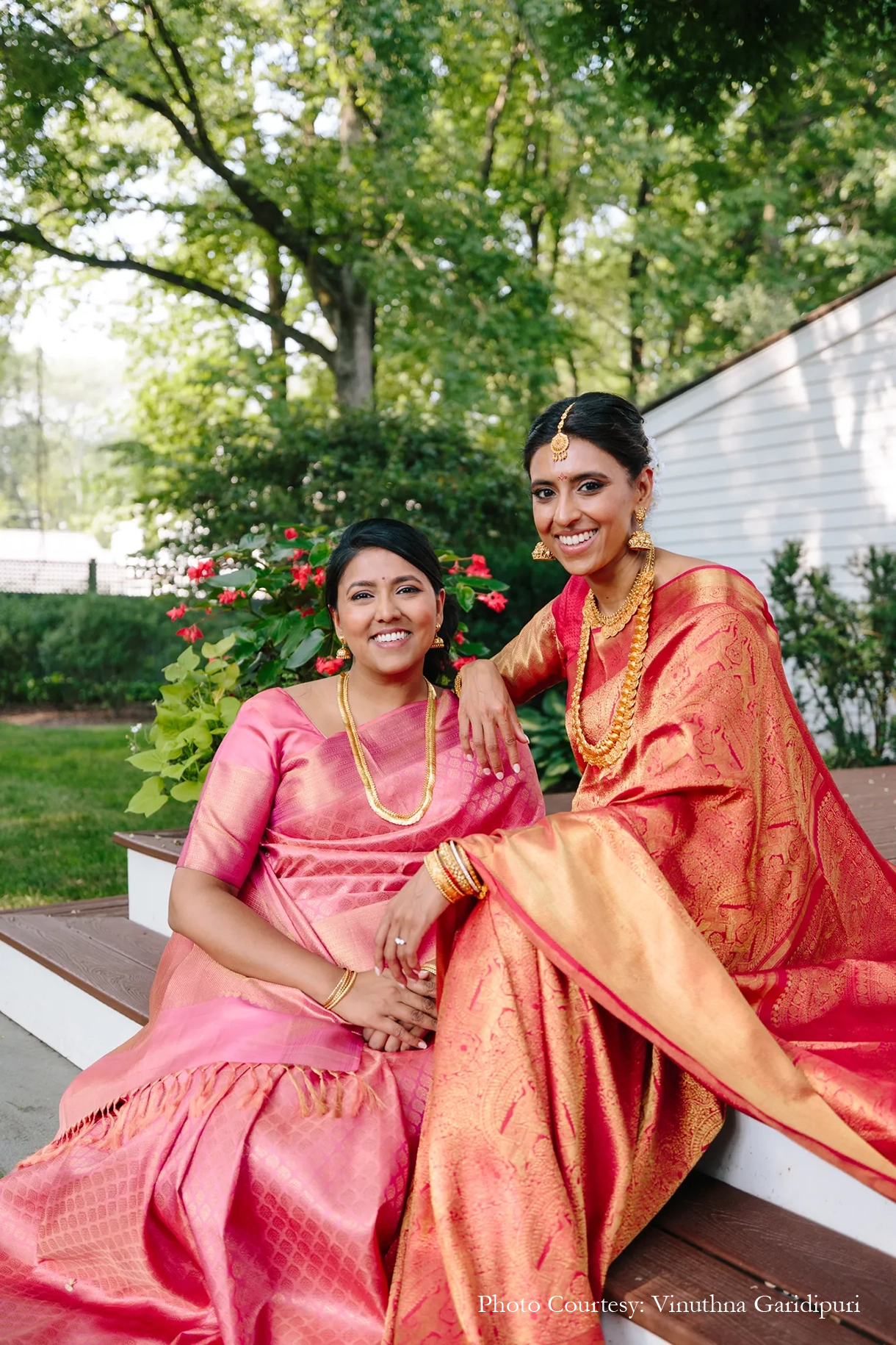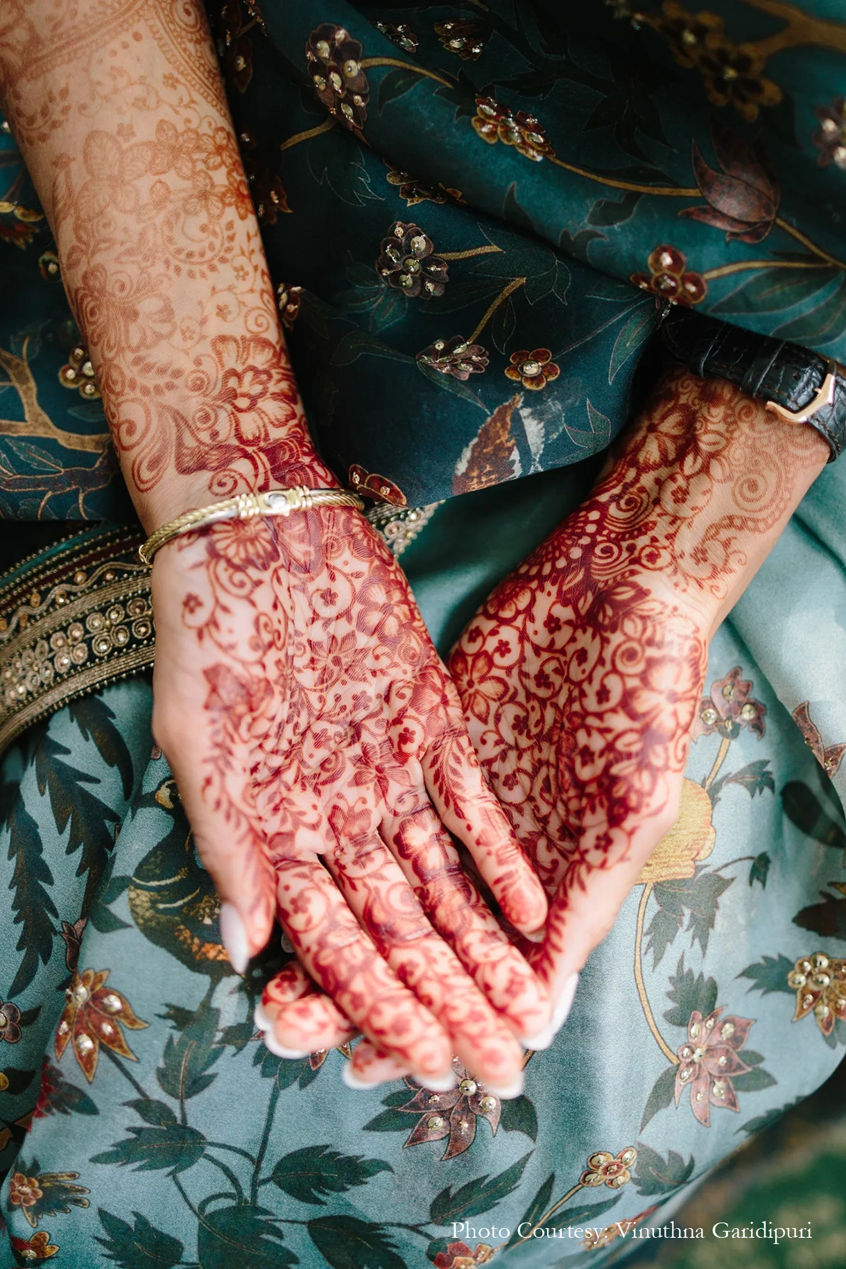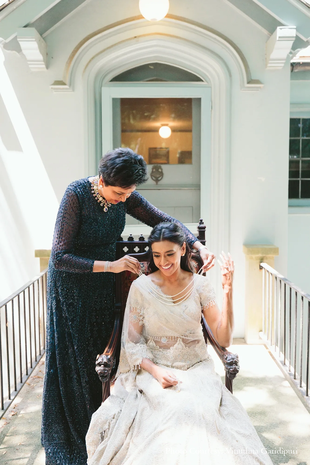 For their cross-cultural wedding celebrations, Preetha combined the best of east and west to gather a wardrobe that fit her style persona. A Tam Brahm girl at heart, she hosted a traditional Hindu wedding earlier wearing a traditional red and gold Kanchipuram silk sari sourced by her mom. As for the other bigger wedding ceremony, they chose ‘A Midsummer Night’s Dream’ theme which looked right at home amidst the July blooms and heat. Their three wedding events were hosted at the bride’s family home in Greenwich, Connecticut, the Hyatt Greenwich, and Blue Hill at Stone Barns.