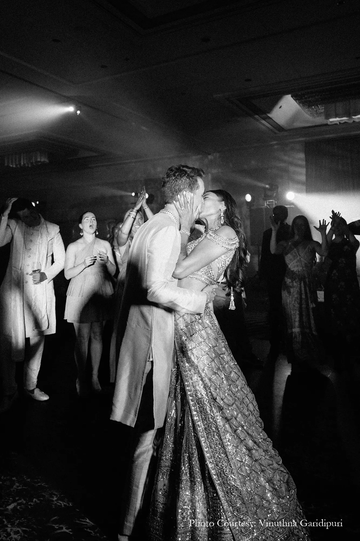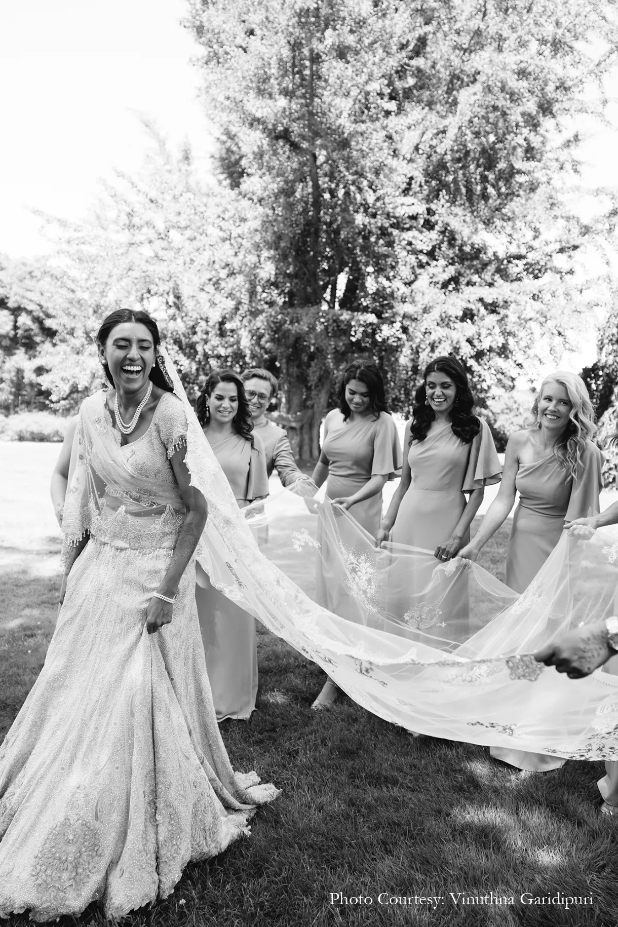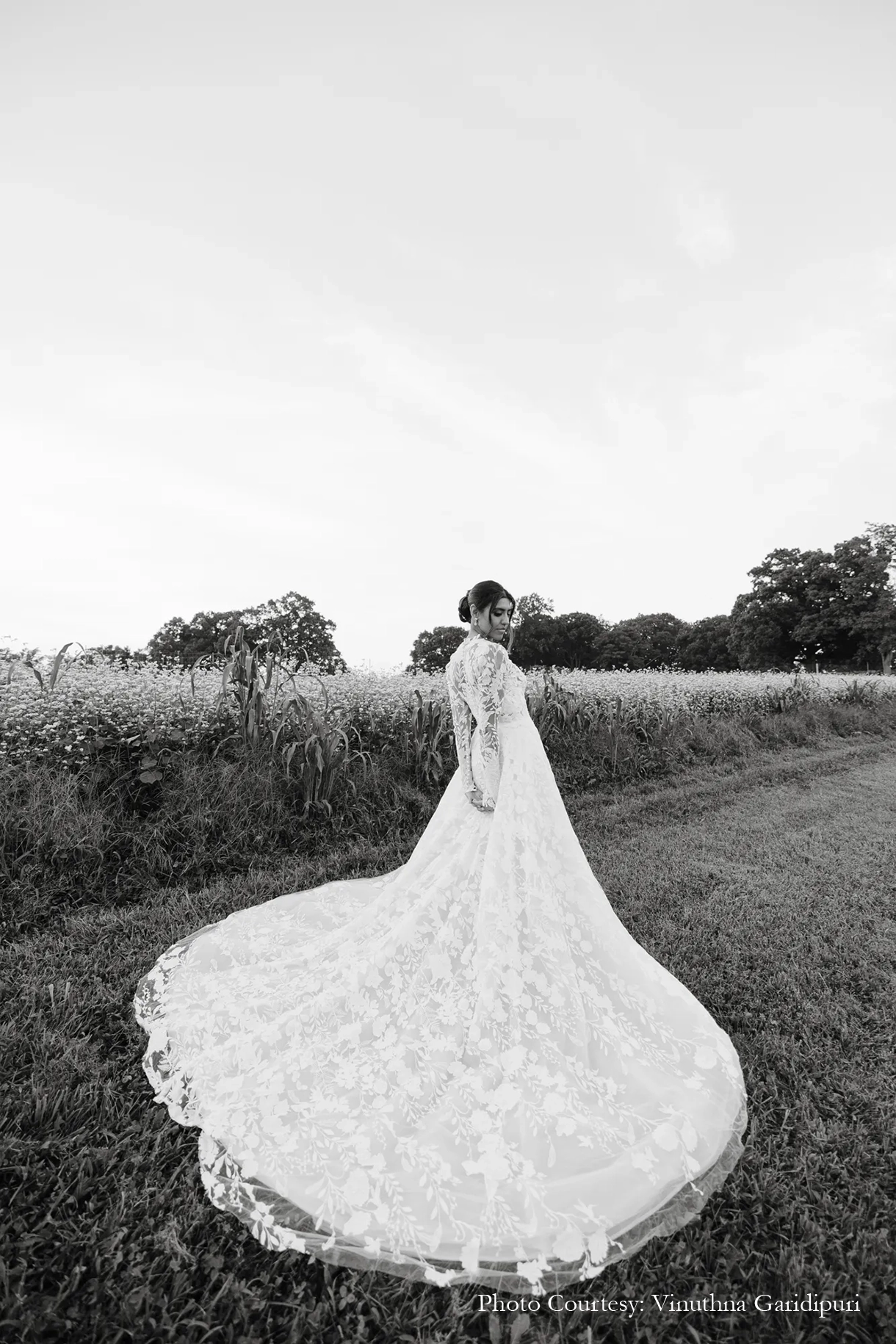 Hosted indoors, Preetha took this opportunity to honour her husband’s family with the bridesmaids and groomsmen donning French blue. On the other hand, the couple wore Indian garbs in white. Post the Hindu and Episcopalian fusion ceremony, the open bar kept the guests entertained with cocktails named after the family pets and a delicious array of farm-to-table appetizers had everyone reaching for second helpings. And, as a nod to the couple’s roots, the American Cuisine was accentuated by South Indian elements.