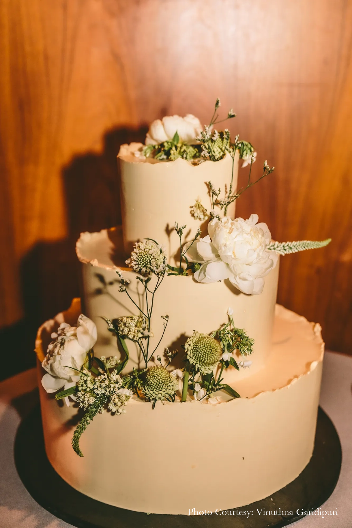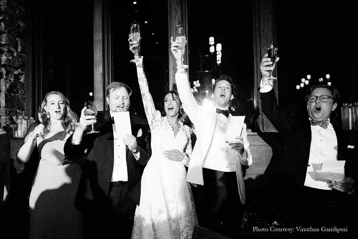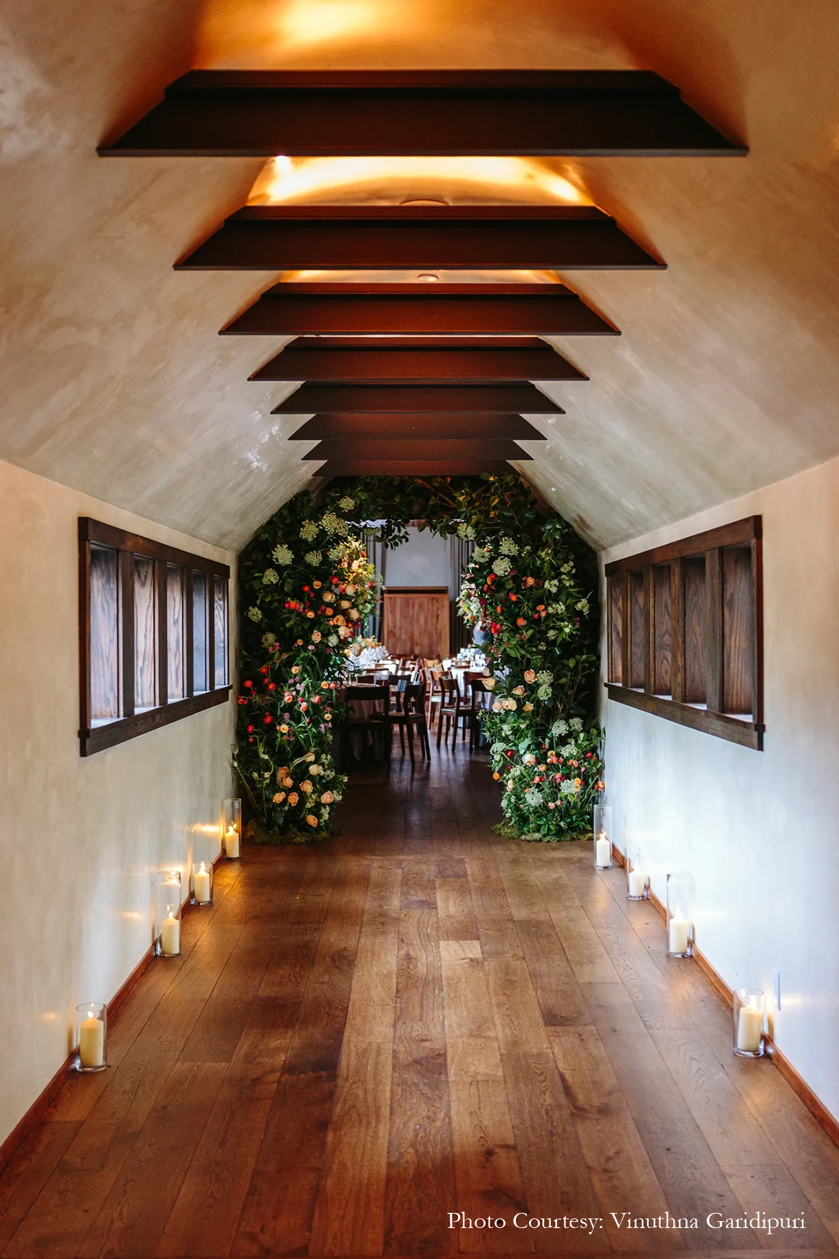 Hosted indoors, Preetha took this opportunity to honour her husband’s family with the bridesmaids and groomsmen donning French blue. On the other hand, the couple wore Indian garbs in white. Post the Hindu and Episcopalian fusion ceremony, the open bar kept the guests entertained with cocktails named after the family pets and a delicious array of farm-to-table appetizers had everyone reaching for second helpings. And, as a nod to the couple’s roots, the American Cuisine was accentuated by South Indian elements.