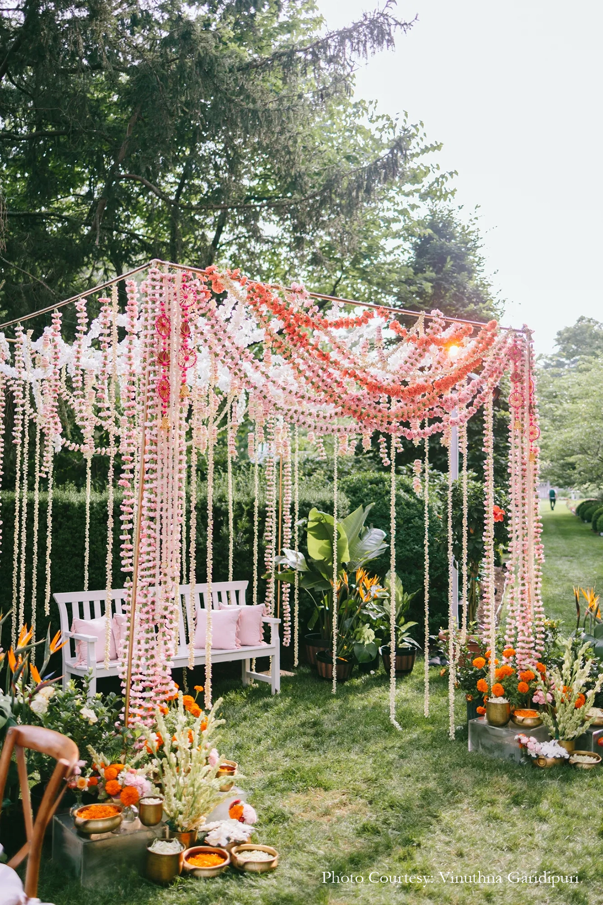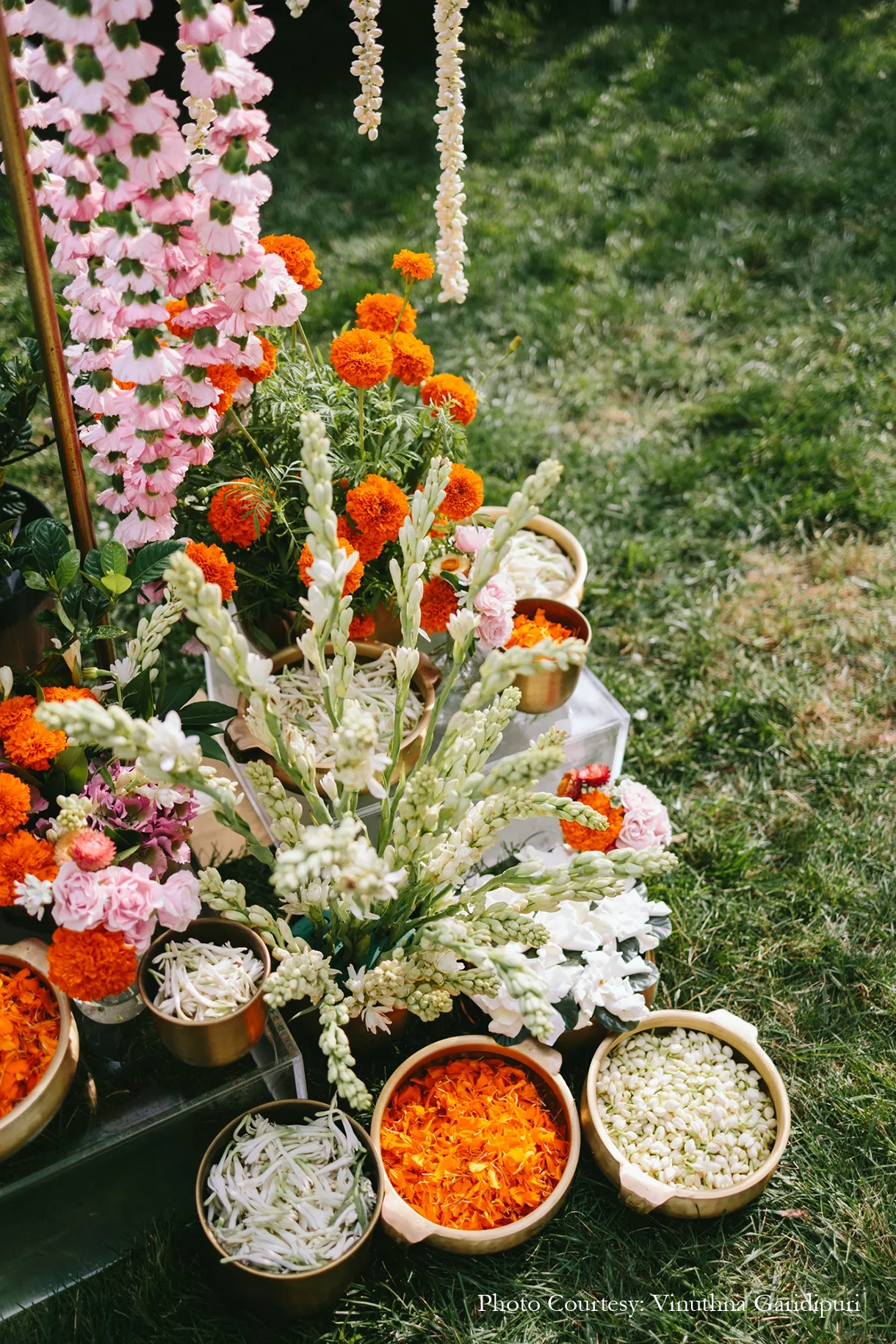 A women-only event at the bride’s home, the source of inspiration for the mehndi decor was the bride’s family homes back in Madras. Taking a cue from her early childhood memories, Preetha included brass pots, jasmine, marigolds, and dark green foliage that brought a small slice of India to Greenwich. For gastronomical pleasures, South Indian finger food and other vegetarian delicacies were spread out for the guests.