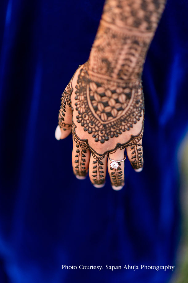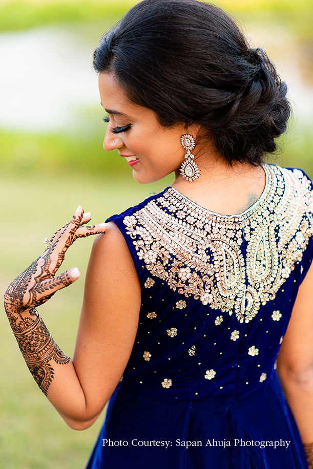 “For my mehndi, we went with simple décor. We created a traditional vibe using marigolds, ethnic looking umbrellas, bright cushions and more. I designed an elegant navy blue gown for this function and made sure that the color of my outfit was in sync with that used in the decor.”