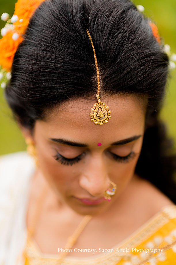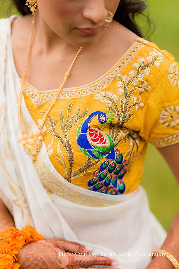 For my vidhi, I wanted a very traditional look and we searched long and hard for my very simple white sari. I wore my grandmother’s wedding nose-ring which has a peacock on it and matched the motif on my yellow blouse. I paired this with fresh marigold flowers in my hair and as bracelets.”
